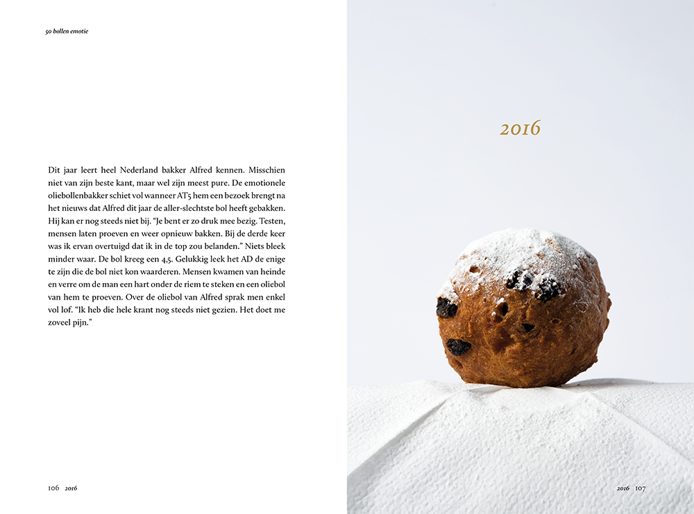 Vorig jaar werd de Amsterdamse bakker Alfred door het AD verkozen tot de slechtste oliebollenbakker van Nederland. Hij was er kapot van en alles waar hij al die jaren zo hard voor had gewerkt werd in één recensie onderuit gehaald. Naast dat er veel te doen is rondom de geloofwaardigheid van deze inmiddels beruchte test, wilden kunstenaars Leon spekken en Tom Hoefnagels iets doen voor Alfred. Op zijn 15de gooide hij de eerste bol in het hete vet en 50 jaar later is dat nog steeds wat hij in de koudste maanden van het jaar doet. Ze besloten een boek te maken waarin ze al die oliebollen verzamelde die hij sinds 1967 heeft gebakken. Een fotoboek over de schoonheid, traditie en passie die komt kijken bij het bakken van oliebollen.