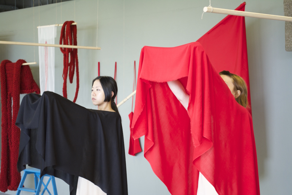 Maar er is meer. Alya betreedt geflankeerd door twee modellen een speelvlak. De objecten aan de wand worden onderdeel van een performance. Lichaam en object komen samen, waarbij de snede in de stof een hoofdrol vervullen. Schijnbaar moeiteloos koppelt Alya Sovjetpopulisme aan Japanse leegte. Alya stookt een prachtif vuur. Als na afloop de ‘attributen’ nagloeien op hun plek aan de wand is er iets onvergetelijks gebeurd.”