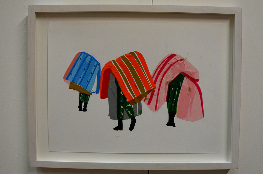Aan de zijmuren van de stand hangen diverse tekeningen die samen verschillende thema’s representeren. Zo zijn er een aantal werken waarin matrassen worden versleept en getild. Oerlemans vindt het een mooi gegeven dat wanneer mensen moeten vluchten ze altijd hun matras meenemen. In nieuwsfoto’s ontdekte ze dit fenomeen en ze maakt tapetekeningen van de mensen en hun matrassen. Aan de rechterwand is een kleine tekening te zien waarop drie soldaten matrassen dragen naar de vluchtelingen. Hun benen zijn zichtbaar en gehuld in legerkleurige broeken. De gezichten zijn niet te zien, deze zijn bedekt onder de felle kleuren van de matrassen.