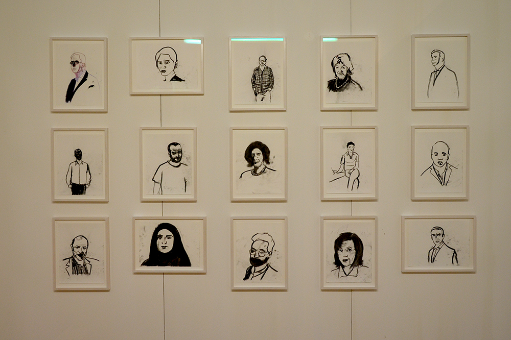 Aan de achterste wand hangen vijftien portretten. Dit zijn mensen die staan in de ‘ArtReview Power 100’ lijst uit 2013, een lijst met de meest invloedrijkste mensen in de kunstwereld. De portretten zijn met een paar lijnen getekend en toch zijn de personen direct herkenbaar. Zo is onderin de invloedrijke Arabische kunsthandelaar Al-Mayassa direct te herkennen. Oerlemans vertelt dat ze op deze manier de belangrijke lijst zichtbaar wil maken en ze was benieuwd of ze overeenkomsten kon vinden tussen de personen. Hoewel dit niet het geval bleek te zijn, waren de ontdekkingen in herkenning, uitdrukking en lijnvoering het onderzoek meer dan waard.