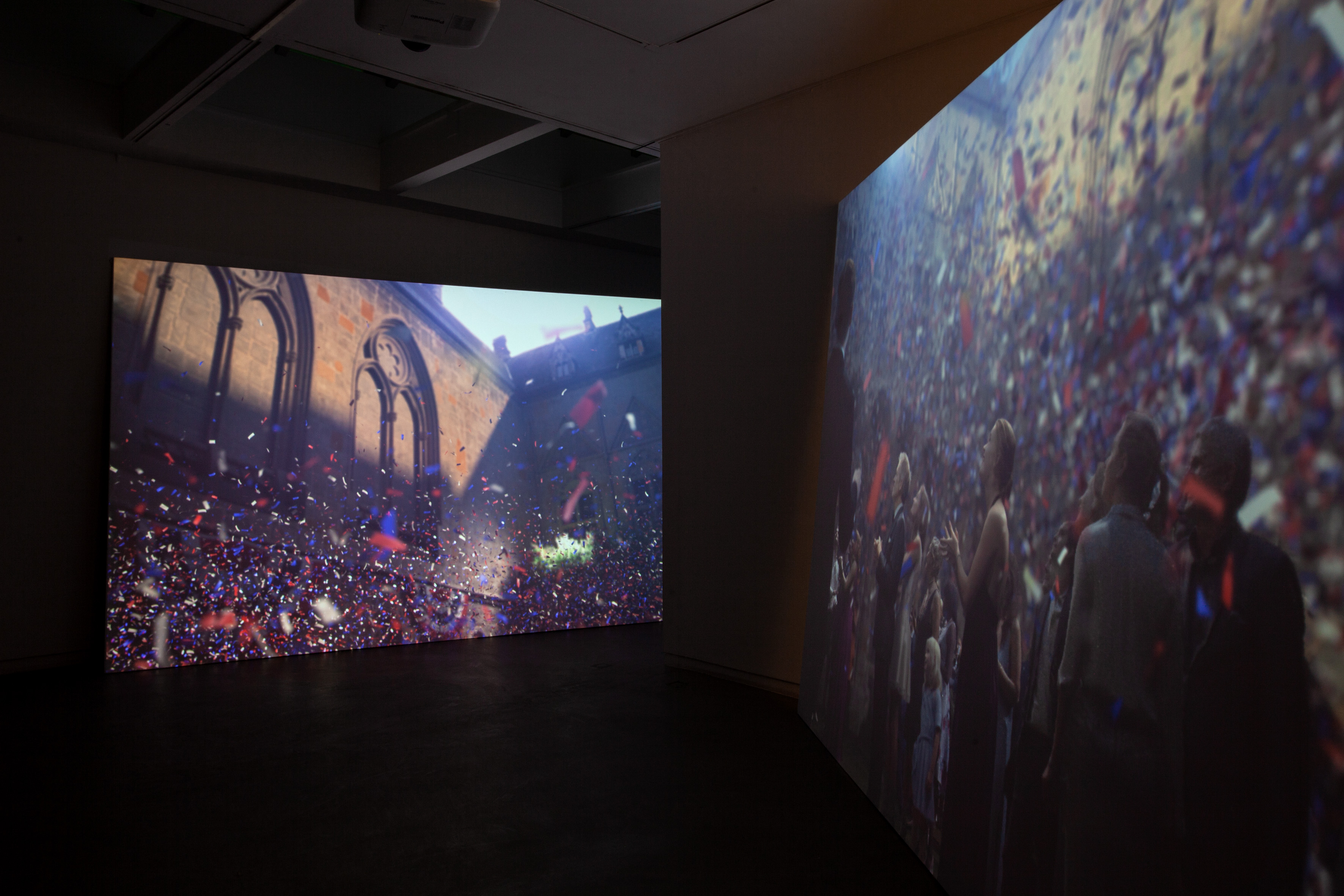 Lachende mensen, klappend of elkaar omhelzend, staren naar duizenden blauw, wit en roodgekleurde snippers die uit de lucht komen vallen. Als een gekleurd gordijn valt de confetti voor het stilstaande publiek langs. Op de twee grote schermen in Annet Gelink Gallery in Amsterdam, wordt een Amerikaanse festiviteit gevierd; een verkiezingsfeest. Kunstenaar David Claerbout speelt in zijn installatie The ‘confetti’ piece met de tijd en onze verwachting. Het cliché ‘de tijd lijkt even stil te staan’ is hier een beangstigend moment geworden in plaats van een verlangen.