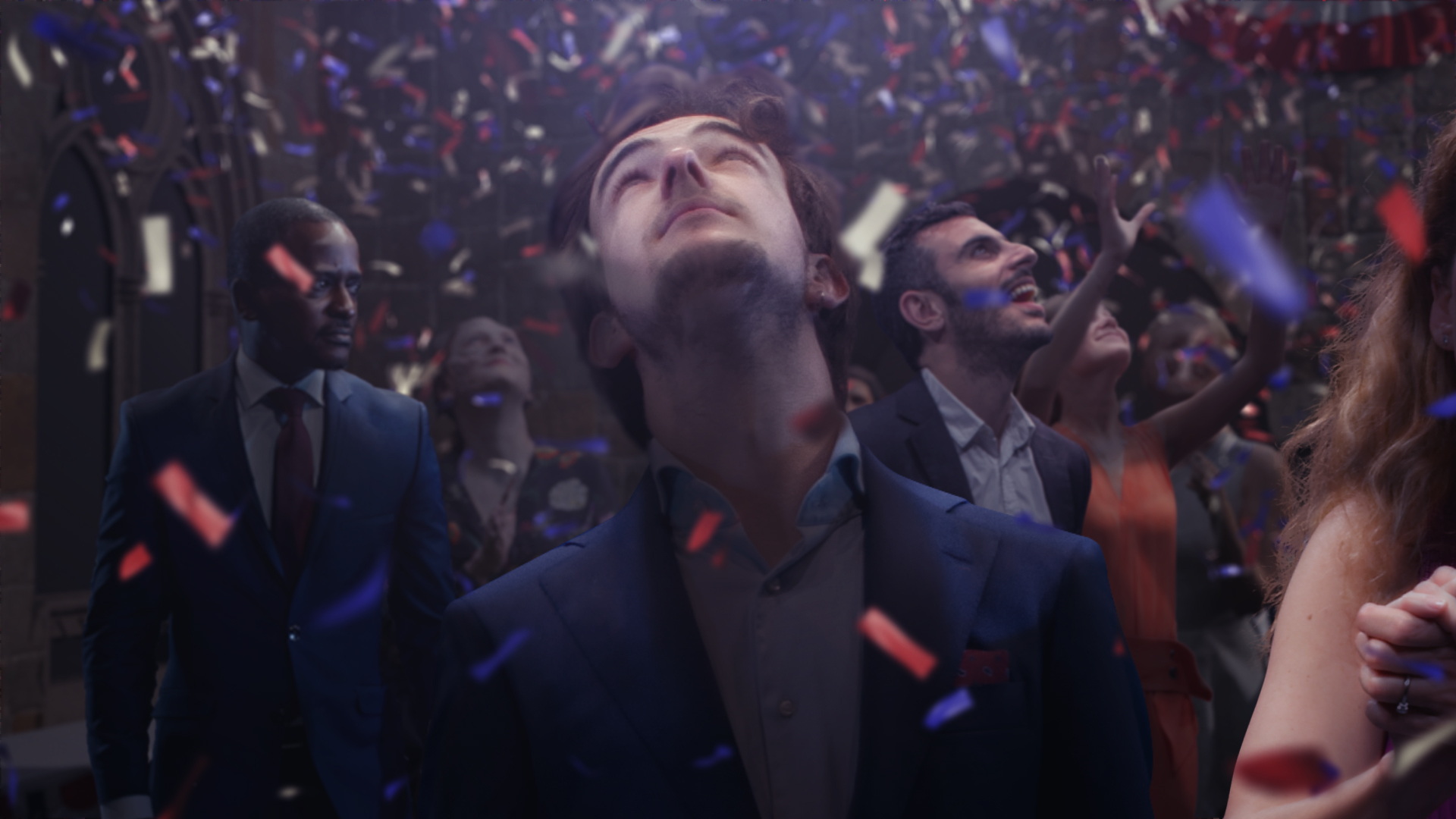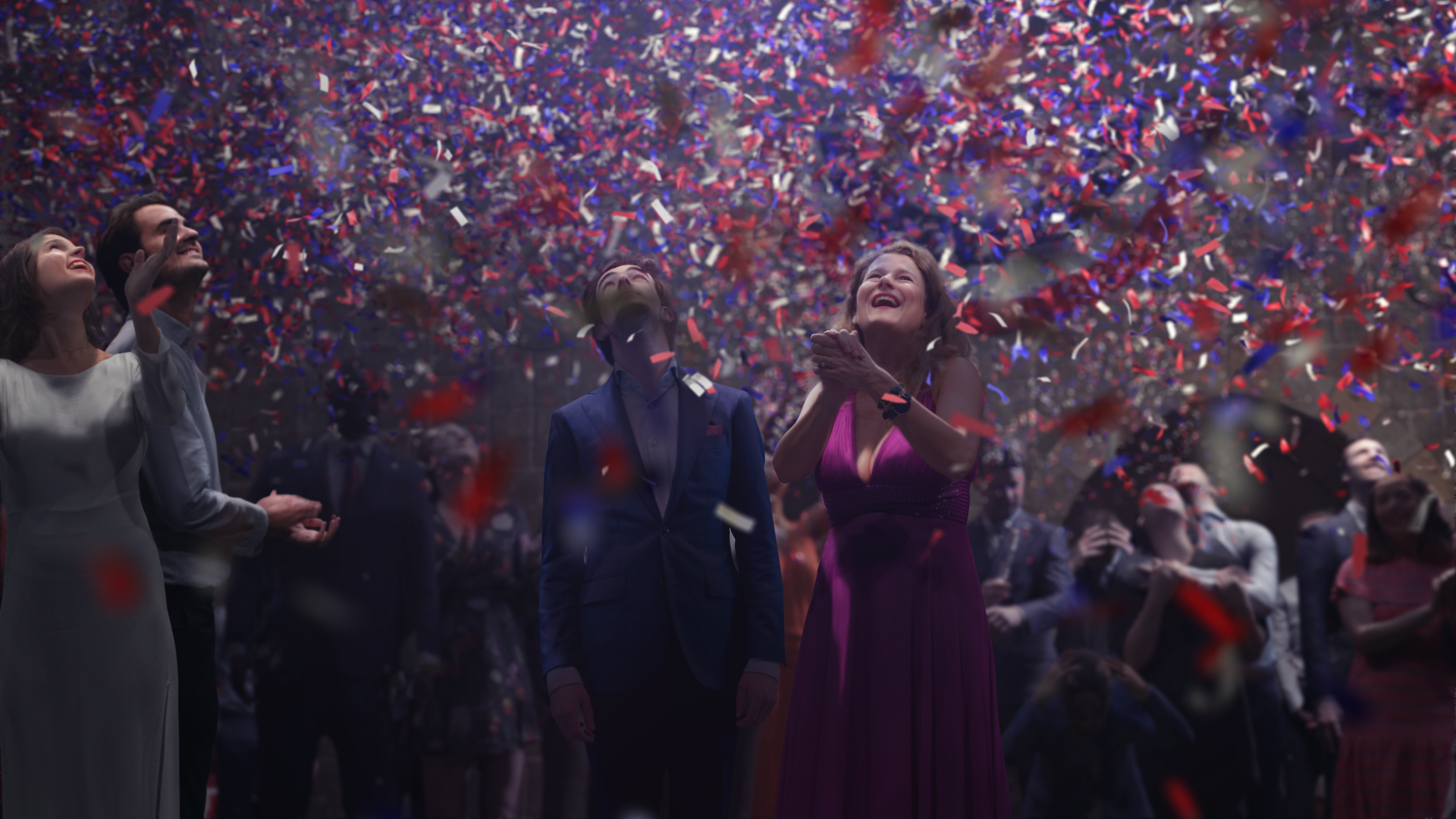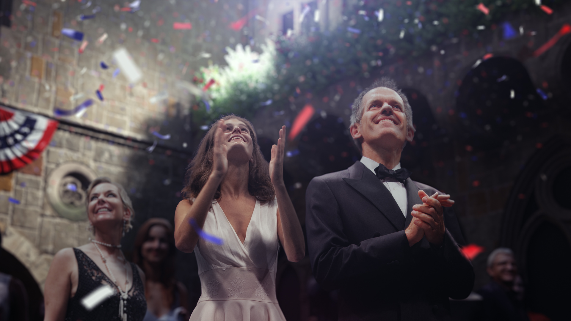 In de constante vertraging volgen de lachende gezichten elkaar door een vervagende overgang op. Dit wordt onderbroken door snel achterelkaar volgende beelden van een paniekerig jongetje in een blauw kostuum. Hij schreeuwt, al blijft het in de galerij stil, en zit met zijn handen in zijn kroeshaar om zijn hoofd te beschermen voor de neervallende snippers. De redenen van zijn paniek begin je direct in te vullen met mogelijke nare ervaringen. Een moment dat hij het liefst zou willen ontvluchten. Om de uitslag van de verkiezingen? Om de winst van de democraten of de republikeinen? Heeft het te maken met zijn huidskleur, evenals de enige twee mensen uit het publiek die het geschreeuw van de jongen opvalt? Een bepaald toekomstbeeld waar de jongen op had gehoopt is met dit feest veranderd en heeft geleid tot het geschreeuw, hem beangstigd. Hierdoor lijkt hij de snippers niet alleen te weren maar ook naar beneden te trekken. De vrolijkheid en het geluk die zij met zich meedragen zo snel mogelijk uit de lucht te willen halen. Voor anderen is het echter een intens gelukkig moment, voor hen is er een winst behaald. Een gevoel dat ze het liefst willen vangen om het later als een parfum weer op te kunnen sprayen; dit willen ze zich kunnen blijven herinneren en herbeleven op een later moment. Dit moment mag vastgezet worden en voor altijd duren.