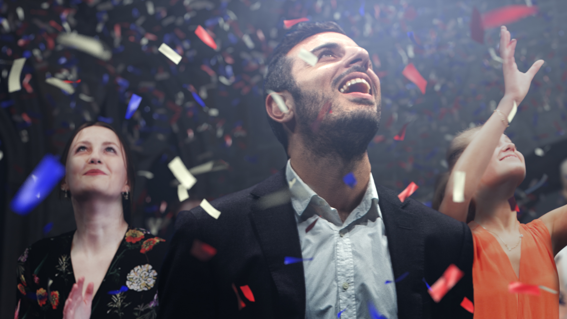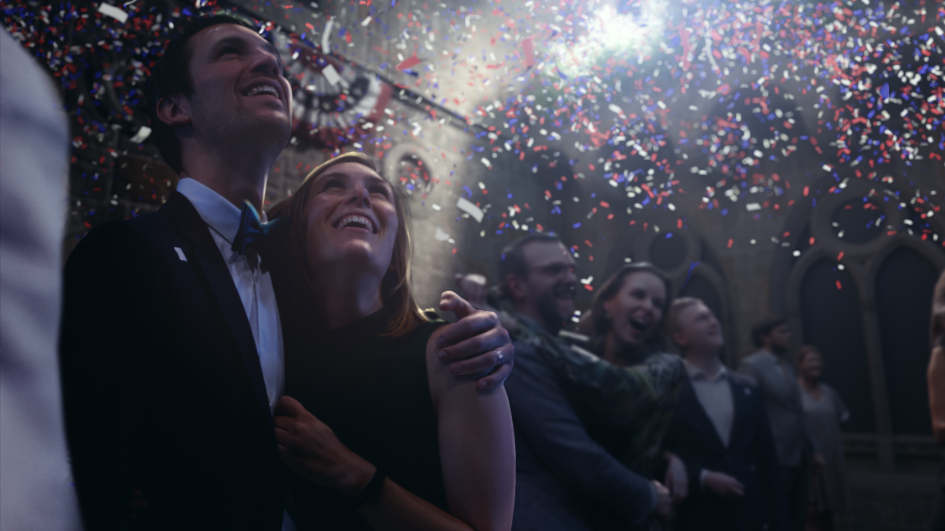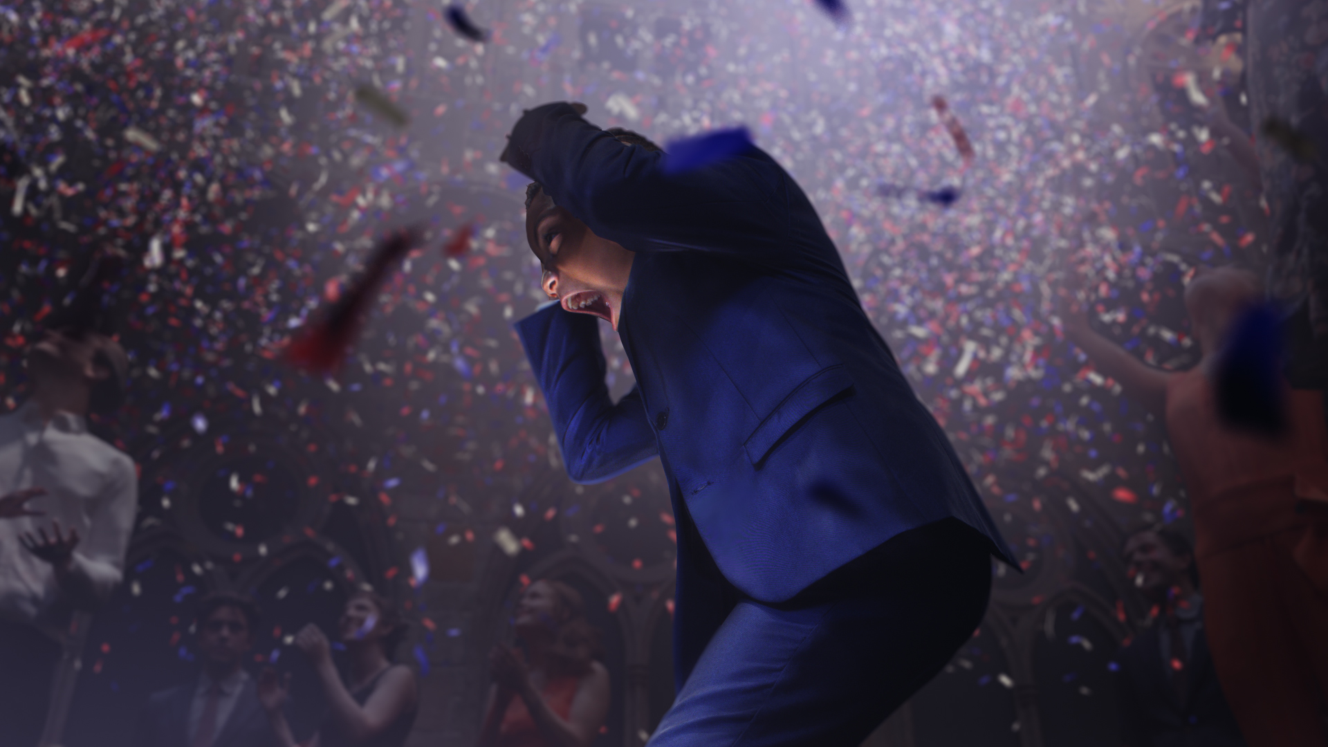 In de constante vertraging volgen de lachende gezichten elkaar door een vervagende overgang op. Dit wordt onderbroken door snel achterelkaar volgende beelden van een paniekerig jongetje in een blauw kostuum. Hij schreeuwt, al blijft het in de galerij stil, en zit met zijn handen in zijn kroeshaar om zijn hoofd te beschermen voor de neervallende snippers. De redenen van zijn paniek begin je direct in te vullen met mogelijke nare ervaringen. Een moment dat hij het liefst zou willen ontvluchten. Om de uitslag van de verkiezingen? Om de winst van de democraten of de republikeinen? Heeft het te maken met zijn huidskleur, evenals de enige twee mensen uit het publiek die het geschreeuw van de jongen opvalt? Een bepaald toekomstbeeld waar de jongen op had gehoopt is met dit feest veranderd en heeft geleid tot het geschreeuw, hem beangstigd. Hierdoor lijkt hij de snippers niet alleen te weren maar ook naar beneden te trekken. De vrolijkheid en het geluk die zij met zich meedragen zo snel mogelijk uit de lucht te willen halen. Voor anderen is het echter een intens gelukkig moment, voor hen is er een winst behaald. Een gevoel dat ze het liefst willen vangen om het later als een parfum weer op te kunnen sprayen; dit willen ze zich kunnen blijven herinneren en herbeleven op een later moment. Dit moment mag vastgezet worden en voor altijd duren.