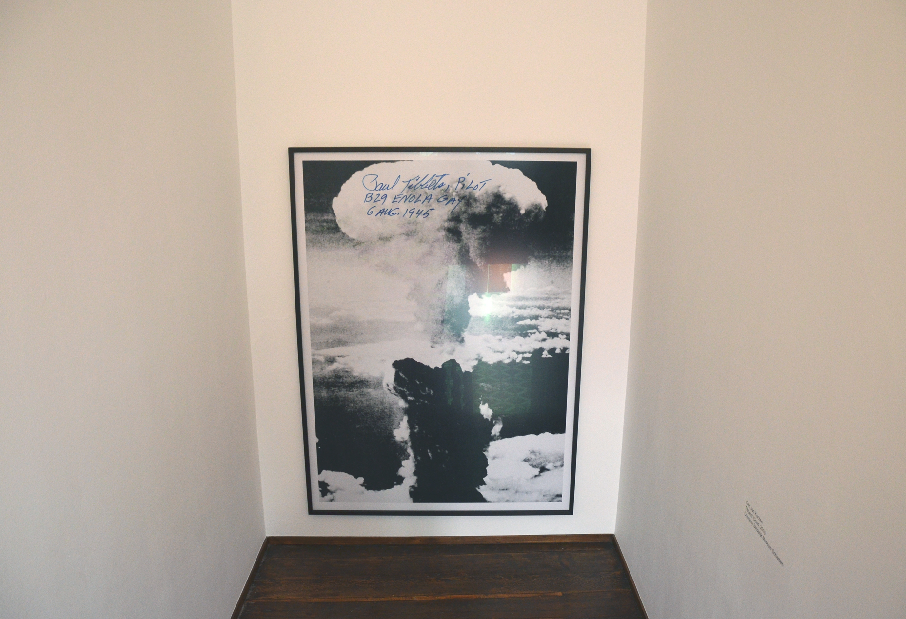 Gert Jan Kocken laat met het werk Tibbet’s Cloud’s een geschiedenis zien die we liever niet hadden gekend. In het trappenhuis van Marres hangt een grote zwart-wit foto. Een uitgestrekte wolkenzee die zich ontluikt in een rookachtige paddenstoel. Het is de iconische foto die we allemaal kennen van de ramp in Hiroshima. Bovenin de foto staat een met blauw geschreven handtekening. De handtekening is van Paul Tibbets, de piloot die de atoombom wierp. Kocken laat met dit werk zien dat de tijd ons moreel verandert. Na 1945 werd Tibbets onthaald als held, hij deelde handtekeningen uit en liet zich zelfs inhuren voor een re-enactment van het bombardement. Zeventig jaar later wordt hij gezien als crimineel, die verantwoordelijk is voor een vreselijke massamoord. Het is pijnlijk om er naar te kijken.