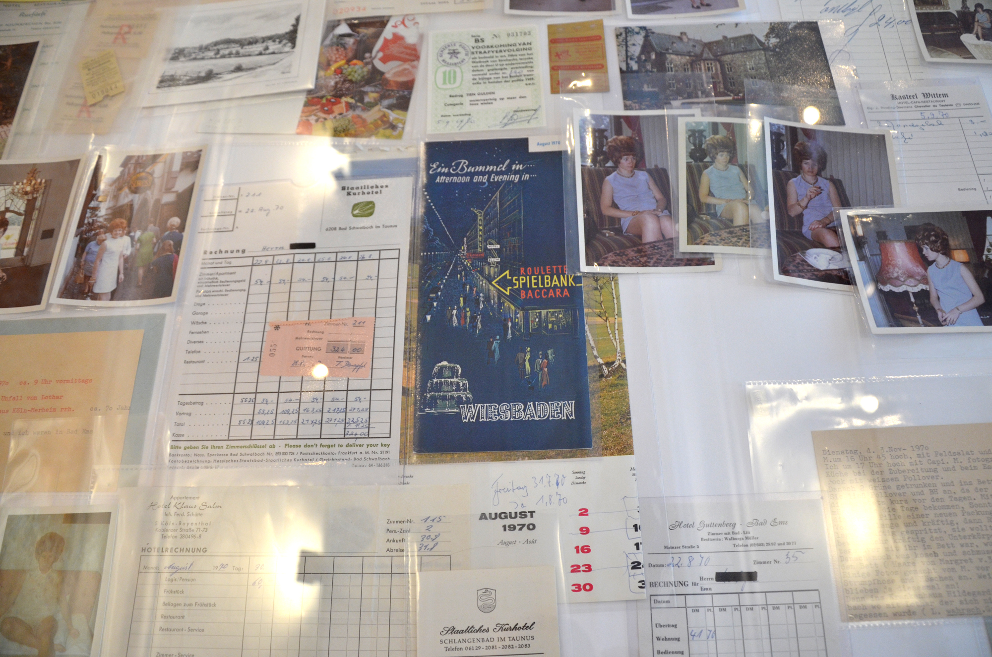 Er zijn echter ook geschiedenissen die zijn weggestop en verborgen. Verhalen die destijds nooit aan het licht mochten komen, maar wanneer dat tegenwoordig gebeurt, ons laten ontroeren en verbazen. Dit is wat er met mij gebeurt wanneer ik de achterste kamer van het pand binnen loop. Er staan twee grote vitrines met daarin foto’s , getypte documenten en snoeppapiertjes. Op iedere foto zie ik een vrouw recht in de camera kijken. Haar blik is uitdagend en zelfverzekerd. Ik zie hier het archief uit 1969 van K.Günter uit Keulen. Hij had een geheime verstandhouding met zijn 24-jarige secretaresse Margret. Op het eerste gezicht lijkt het om een man te gaan die verliefd is op zijn affaire. Wanneer ik echter de brieven lees en de anticonceptie strips met lijstjes erbij zie liggen, krijgt het archief een andere lading. In de brieven wordt ieder seksstandje haarfijn uitgelegd en op de lijstjes is Margret anticonceptie gebruik netjes bijgehouden. Deze man was niet alleen verliefd op zijn affaire, hij was geobsedeerd door haar en de bezoeker wordt de ongemakkelijke deelgenoot van deze schimmige affaire. Het is geschiedenis waar niemand eigenlijk van op de hoogte behoort te zijn.