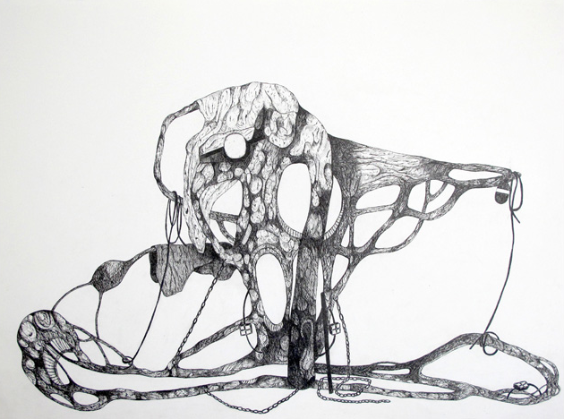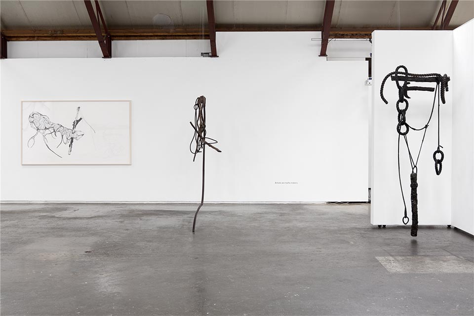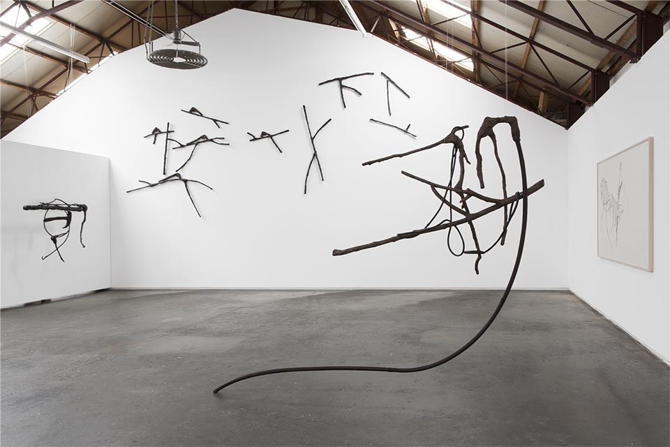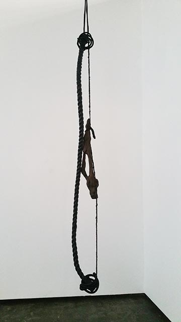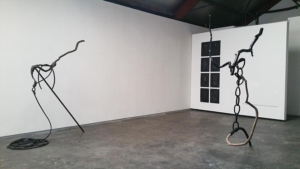 Zwarte takken hangen als botten in de ruimte. Als familie van de tekeningen, zijn ook zij gegrepen in allerlei constructies van touw, kettingen en balken. De grillige vormen en de aardse bezieling maken de sculpturen krachtig, mystiek en tragisch. Tegelijkertijd tonen ze hun fragiele karakter en zijn het verwonde beesten, waarbij de kracht hem zit in de intensiteit en emotie.