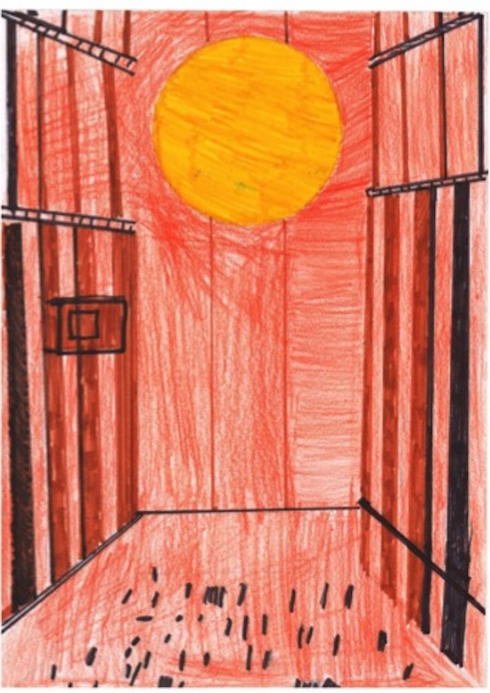 Olafur Eliasson maakte een hele grote zon die in de Turbine Hall van het Tate Modern hing. Zo konden mensen daar genieten van een zonsondergang. Amelia vond dit een prachtig werk en kleurde met veel liefde haar eigen versie.
