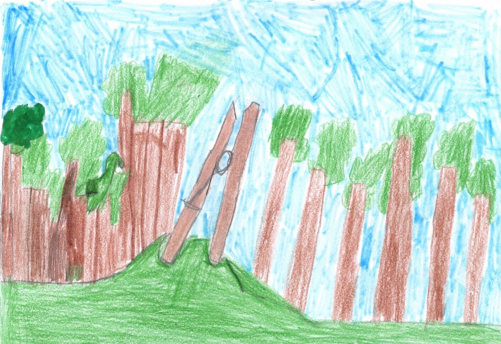 ‘Er was eens een kunstenaar en hij dacht: ‘Ik wil dit park opfleuren. Het is een beetje saai hier.’ Hij keek eens goed door het park. Hij voelde even in zijn zak want hij had honger. Maar toen vond hij een wasknijper in zijn zak. Hij pakte de wasknijper en richtte die op een bergje. Hij dacht: dit is wat ik ga maken. Ik ga een mega wasknijper maken en vragen of ik het mag neer zetten. – Einde -‘ Max (9)