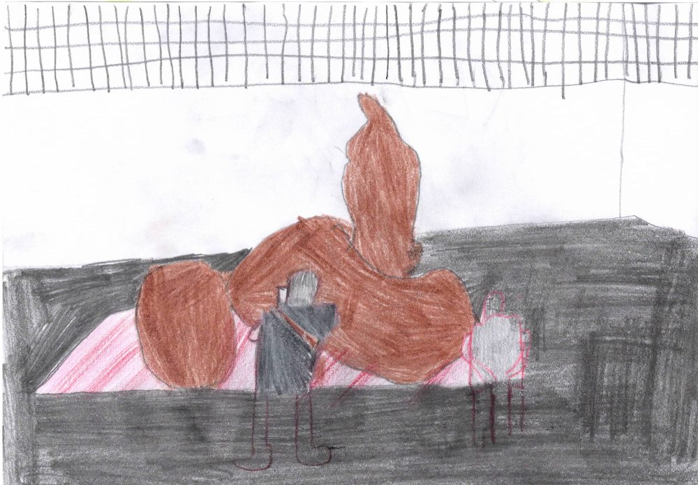 ‘Op het kunstwerk van Melanie Bonajo zie je een oranje lucht en een oma die diep in de troep zit. Het ziet er heel grappig en heel serieus uit. Daardoor blijf je kijken. Ik denk dat die oma ons wil zeggen dat we onze troep op moeten ruimen omdat het anders in de oceaan komt. Ik vind het erg mooi bedacht, om dat zo te vertellen. Ik denk dat die oma de wereld wil redden. Haar boodschap is denk ik dat we samen op moeten ruimen als we ook zo lang als haar willen leven. Mijn complimenten voor degene die dit heeft bedacht en gemaakt. Het zet je echt aan het denken. En tegen die oma wil ik graag zeggen: dapper dat u tussen al die troep durft te zitten. U bent een held!’ – Roël (10)