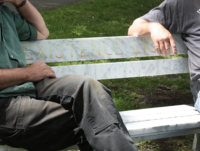Mijn kunstbijdrage is een marmeren bankje met het opschrift “EXISTENCE LIGHT”, gegraveerd en geschilderd in een zonsondergang kleurverloop op de rugleuning. Existence light is ook de naam van het toegankelijke lettertype waarmee dit uit het marmer is gehouwen. SKOR gebruikte ook toegankelijke lettertypes als link naar de publieke ruimte; gratis toegankelijk voor iedereen. Het bankje gaat over de opkomst van afwerende architectuur, het wordt steeds moeilijker om gewoon ergens te kunnen zitten zonder daarvoor eten of drinken te moeten bestellen. Een reden voor het gebruik van marmer is om na te denken over de ontwikkeling van kunst in de openbare ruimte in het afgelopen decennium; het marmer is een link naar het meest archetypische idee van een beeldhouwwerk, zoals een beeld uit de klassieke oudheid. SKOR zorgde voor kunst in ziekenhuizen en andere welzijnsorganisaties, het leek mij nou leuk om een plek van welzijn te creëren in een plek die gedomineerd wordt door kunst: aan het water voor de kunstacademie.