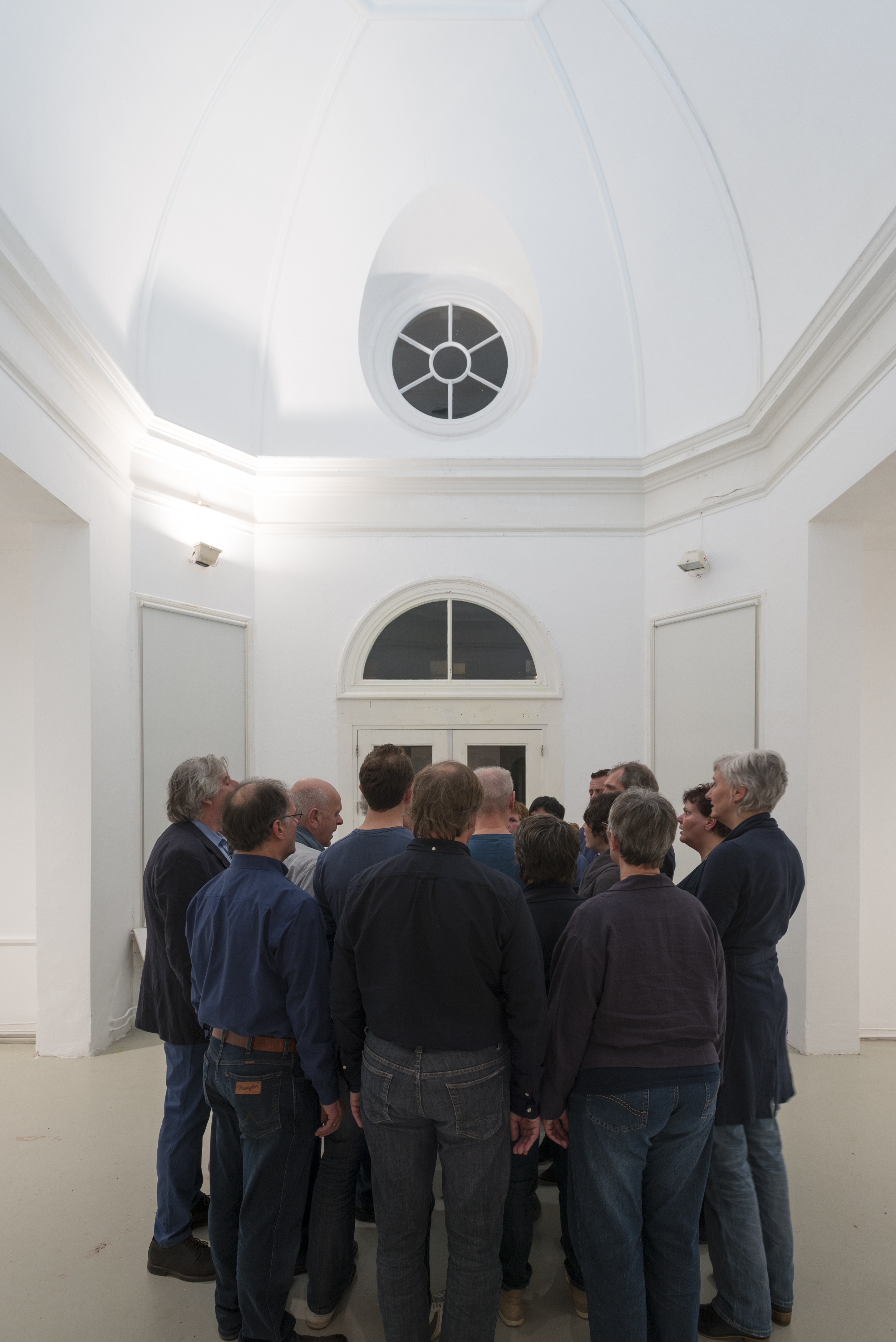 Zo weinig ruimte als de zangers met hun opeengepakte lichamen innemen, zo ver reikt het geluid dat ze voortbrengen. Hun samenzang torent als een zuil boven hen uit. Aan de voet daarvan staan wij, de toehoorders, als voor een onneembare vesting. Onze blikken stranden op de ruggen van de zangers, die iets lijken af te schermen. Het is alsof we naar de achterkant van de performance kijken, er niet helemaal bij kunnen.