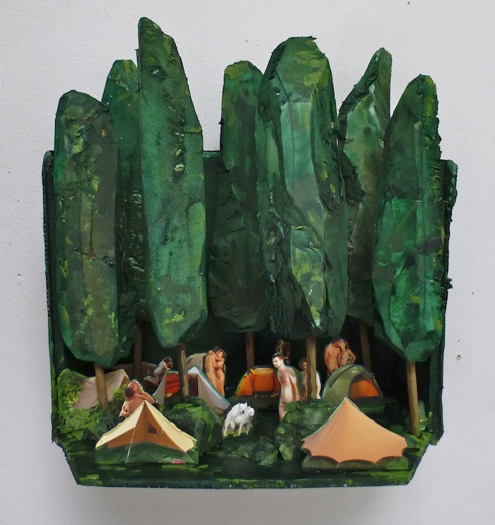 De cinematografische transformaties in het werk van Lars Weller vinden we op een andere manier terug in de schilderijen en de 3d collages van Marit Dik. Vooral die collages zijn gemaakt als een miniatuur-set voor een film. Je kunt je er hele scènes in voorstellen. Het zijn als het ware opengewerkte decors waarin camera’s vrijelijk kunnen bewegen om iedere gezichtshoek mogelijk te kunnen maken.