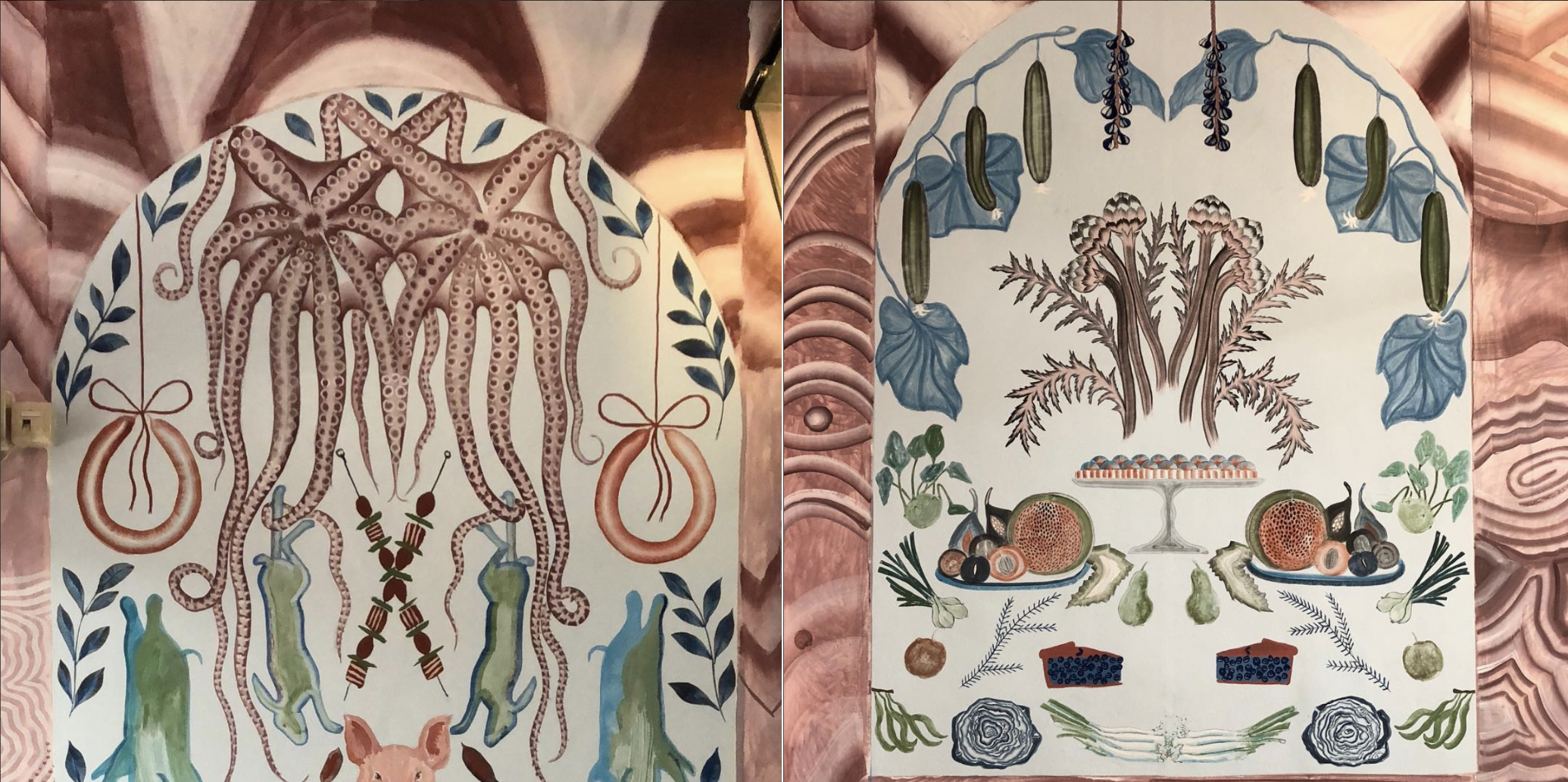Ook is er Gijs Frieling, een kunstenaar die op zijn beurt weer een andere kwaliteit van het schilderen toont: het visualiseren van persoonlijke gedachten en daarmee het bieden van een andere blik op de wereld. Bij de entree naar het restaurant van het Dordrechts Museum heeft de kunstenaar ieder stukje muur opgevuld met krullende octopustentakels, punten bosbessentaart en rode kolen, omgeven door zijn karakteristieke organische kleurvlakken, ditmaal in bruinrood. Vandaag gebeurt het delen van voedsel onder #foodporn of #instayum (ik verzin dit niet). Met een iPhone genomen foto’s worden, al dan niet met filter, binnen één druk op de knop verspreid onder volgers. Het surrealistische droombuffet dat Frieling de kijker voorschotelt, lijkt een subtiel tegengeluid te bieden aan de dertien-in-een-dozijn cappuccino’s met cacao hartjes. Voor de kunstenaar staat het vervaardigen van een schilderij gelijk staat aan het visueel maken van een innerlijke voorstellingswereld. Een wereld die in je verbeelding nog diffuus is, maar verfstreek na verfstreek zichtbaar wordt gemaakt. Het ei-tempera maakt het mogelijk om herhaaldelijk aanpassingen te doen in de eerder gezette toetsen, om langzaamaan de beoogde afbeelding te kunnen ontsluiten.