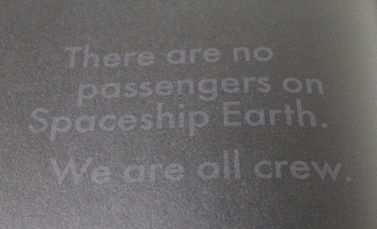 Achter in het boek 3P’s staat op twee gitzwarte pagina’s in net niet zwarte letters een quote van de Canadese filosoof en wetenschapper Marshall MC Luhan. ‘There are no passengers on Spaceship Earth. We are alle crew.’ De quote refereert aan het boek Operating Manual Spaceship Earth. Buckminster Fuller stelt in dit boek dat de aarde als een ruimteschip is waar de middelen beperkt zijn en bevoorrading niet mogelijk is. Egoïsme is volgens hem absoluut onnodig, samenwerking de sleutel tot het redden van onze globe. Toch gaat die verantwoordelijkheid vaak over persoonlijke keuzes. Jij bent degene die beslist wat in je in de winkel koopt en jij bepaalt thuis wat wel of niet weggegooid mag worden.