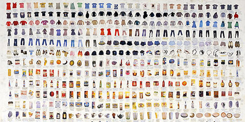 Nu, acht jaar na het maken van dit werk, vermoed ik dat Evans nog maar weinig spullen bezit die hij destijds categoriseerde. Het meeste eten uit de opsomming is na een week of twee al vervangen door nieuw voedsel. Ook in zijn vele zwarte truien zullen de gaten zijn gevallen. Spullen hebben nou eenmaal vaak een korte levensduur, om de maatschappij te blijven voeden.