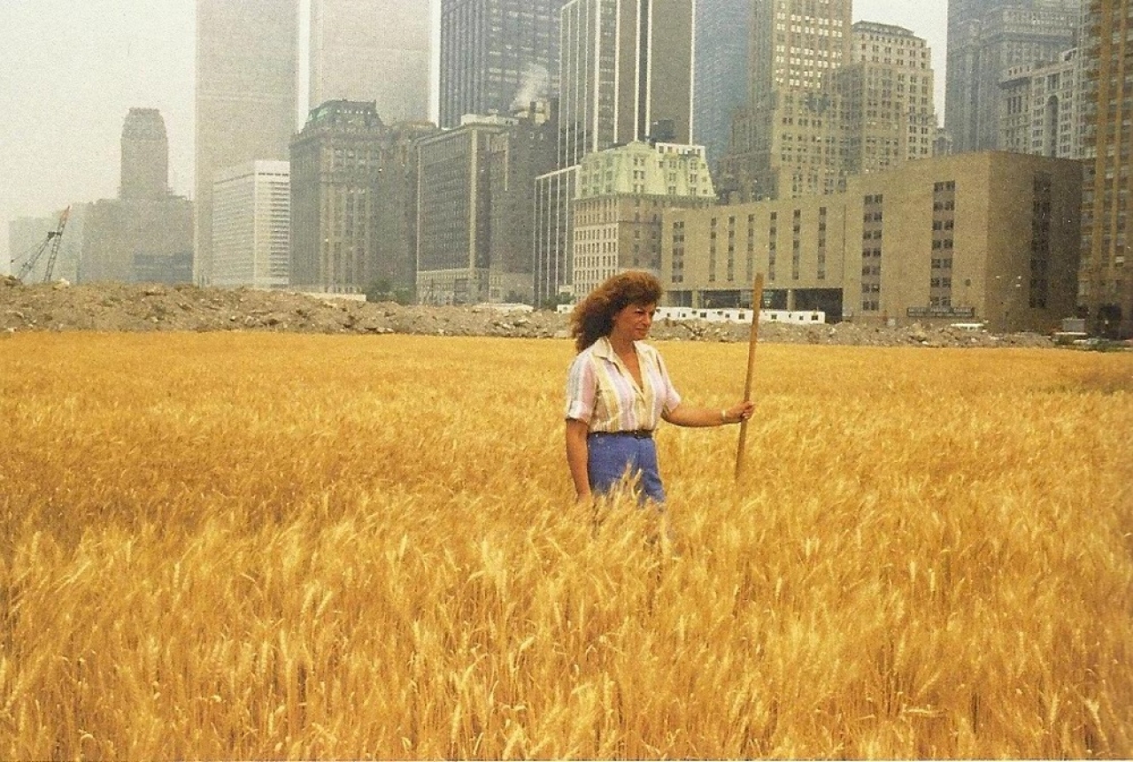 Agnes Denes draaide de rollen om toen zij in 1982 niet zelf de natuur in trok, maar de natuur naar zich toe haalde. Midden in ‘downtown’ Manhattan plantte zij op een stuk braakliggend terrein een enorm graanveld. Ze verzorgde het vier maanden lang totdat het volgroeid was en oogstte toen het graan. Dit werd vervolgens uitgedeeld aan bezoekers in exposities over de hele wereld zodat hetzelfde graan weer opnieuw kon groeien. Met dit project heeft Denes iets onvoorstelbaars voor elkaar gekregen. Op een paar honderd meter afstand van de voormalige Twin Towers konden de bewoners van Manhattan ineens uitkijken op een landelijk tafereel. Denes gaf iedereen een stukje landschapskunst cadeau.