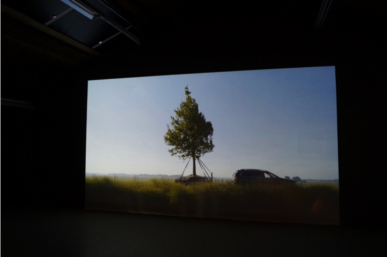 Een bijna muurvullende projectie vult de donkere studio. Op het beeld, gemaakt door Inge Meijer, is een idyllisch, vlak landschap te zien dat voorbijsnelt. Het hoge gras op de voorgrond blokkeert de blik op de even vlakke horizon. Na enkele seconden doemt het blauwe dak van een stationwagen op. Op de aanhanger van de geblindeerde auto staat een boom. De linde is met wortel uit de grond getrokken en trotseert de snelheid, bijgestaan door de support van vijf touwen die de stam op zijn plek houdt. Het is als de zojuist gekochte vis, die in een benauwend plastic zakje van de dierenwinkel naar het aquarium wordt vervoerd: van de ene leefbare omgeving, onderweg naar een andere. De hoop dat de tocht wordt overleefd, is wat rest.