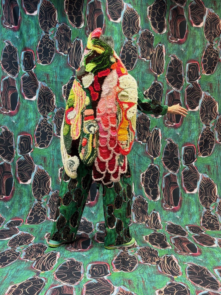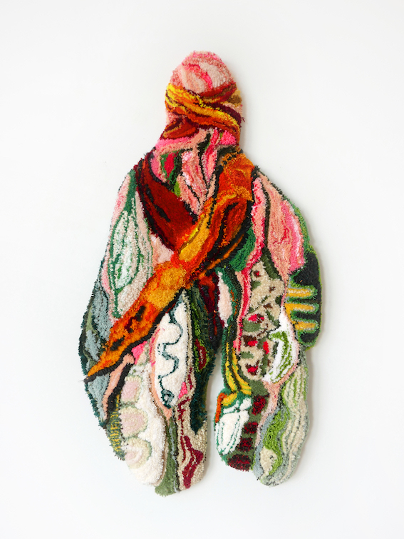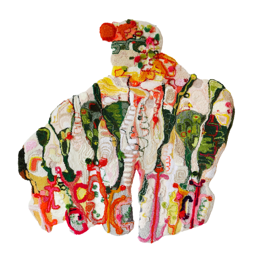 Als Marjo Postma het frame omdraait waarop ze een groot textielwerk aan het tuften is, zie ik dat ze op de tegenkant een krantenfoto van een baviaan heeft geprikt. De aap kijkt je recht in de ogen. ‘Hij kijkt of ik wel hard genoeg werk’, zegt Marjo. Daar hoeft hij niet aan te twijfelen, want haar grote atelier in Pakhuis Wilhelmina aan de Veemkade in Amsterdam, dat ze deelt met haar man, grafisch ontwerper Michiel Uilen, barst van de energie en haar beeldende werk is onontkoombaar aanwezig. De baviaan geeft eerder rekenschap van het belang van haar menselijke verbeelding van de schepping. Ze is ondergeschikt aan het natuurlijke leven dat haar omringt en daar wil ze in haar werk verantwoording over afleggen.