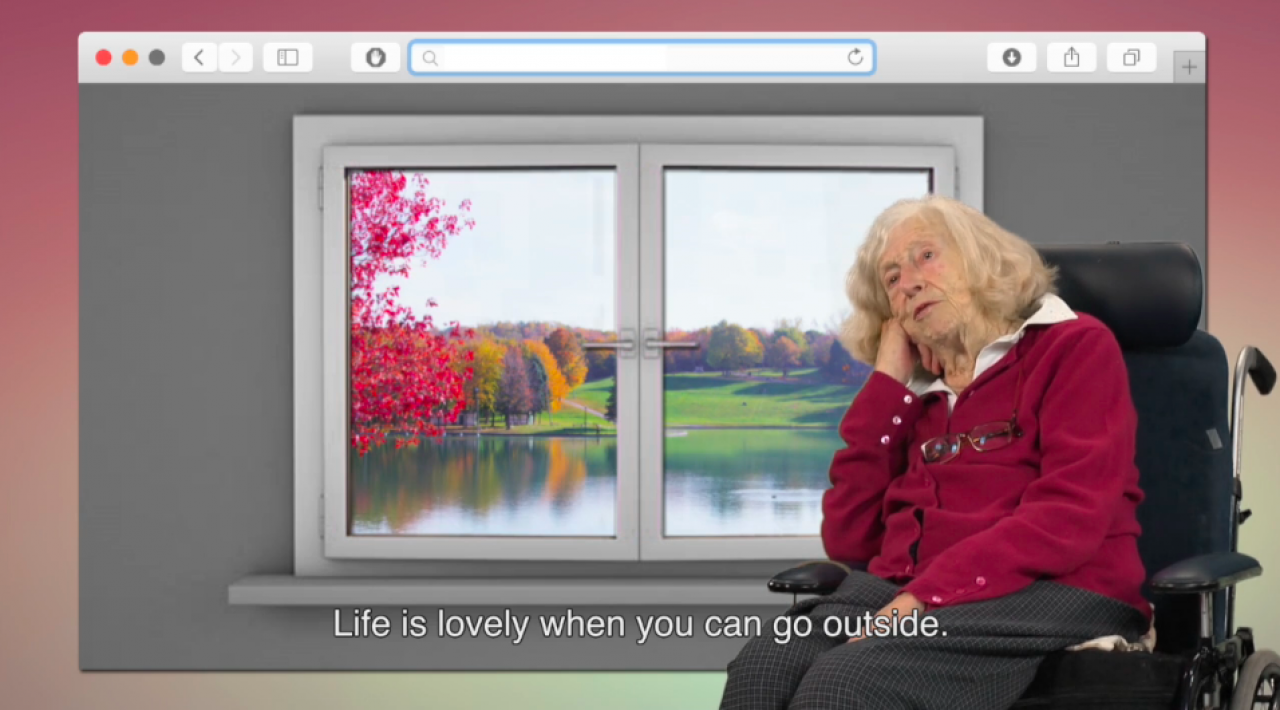 In Melanie Bonajos videowerk ‘Progress vs. Regress’ uit 2016 zagen we al hoe de technologie onze levens in beslag heeft ingenomen. In haar film worden ouderen geïnterviewd in een bejaardentehuis en geconfronteerd met een selfiestick. Één van de bewoners zegt dat het allerergste van ouder worden, het verliezen van haar onafhankelijkheid is. ‘Er zijn hier zoveel regeltjes’. Een andere bewoner vergelijkt het tehuis met een gevangenis. Ze herinnert zich ook een verzorgster die haar een nachtkus op haar voorhoofd gaf. Ze mist de aanraking en het menselijk contact. De onderwerpen die hier worden aangesneden zijn nu relevanter dan ooit.