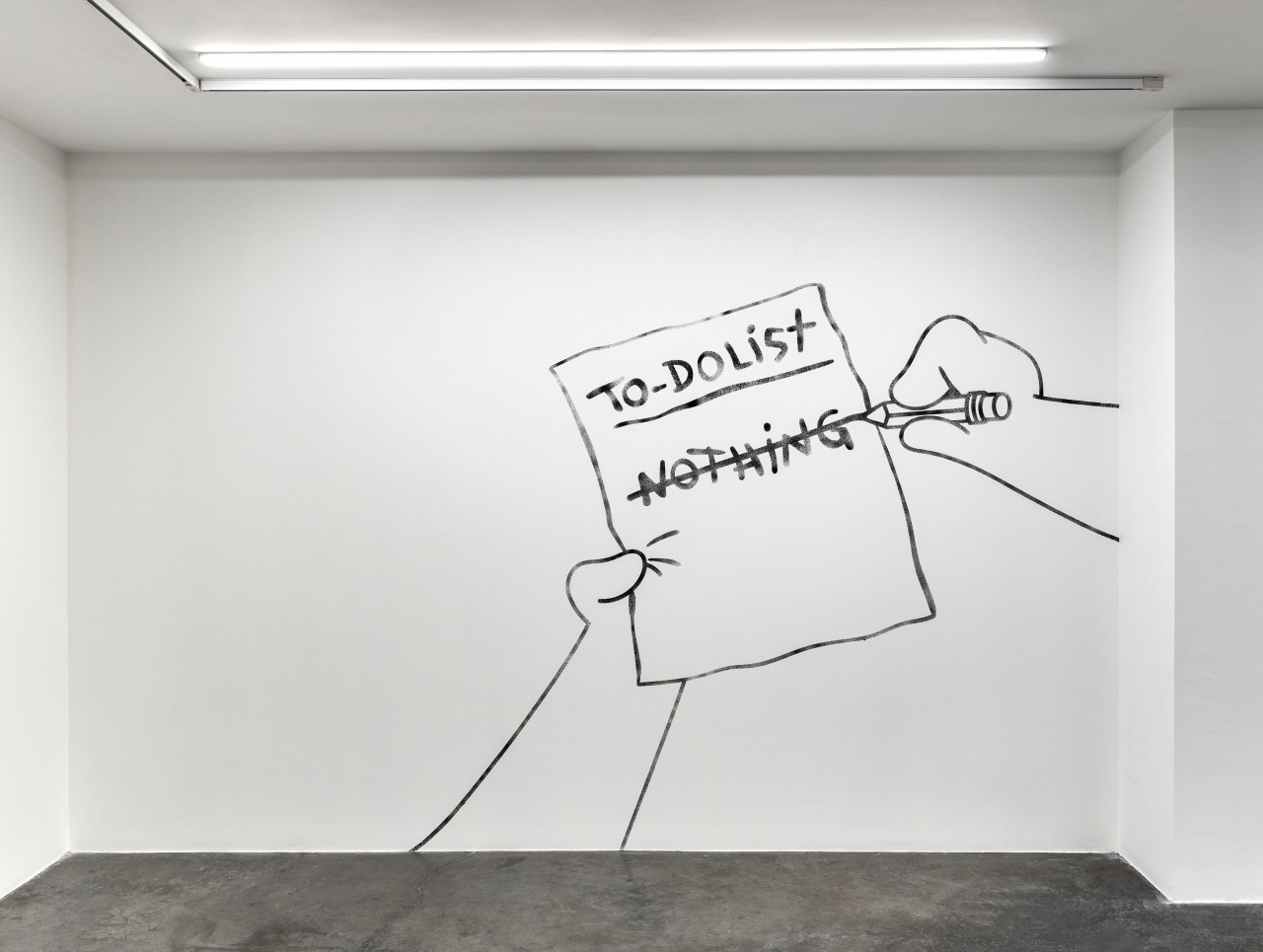 De tentoonstelling werd meteen met een 360º camera online gezet en veel reacties gingen over het werk waarin hij de bekende internetmeme To-do list nothing, met een oeroude techniek aanbracht op de wand: het spugen van pigment op de wand, zoals holbewoners deden in hun grotten. ‘Nothing is precies wat ons nu verplicht wordt om te doen. Niet naar buiten, niet naar kantoor, niets. Ik vind het prachtig dat het moment van ‘nu’, mijn werk opslokt en van een dikke laag betekenis verschaft. Betekenissen worden altijd door het verstrijken van tijd aangepast. Of dat nou vóór- of ná Corona is. Kijk hoe we gissen naar de betekenis van het silhouet van een hand op een rotswand dat 40.000 jaar geleden werd gemaakt. Er zijn zoveel theorieën. We zullen het nooit weten. Net zoals deze prehistorische hand, kunnen deze meme’s op talloze manier worden geïnterpreteerd.’