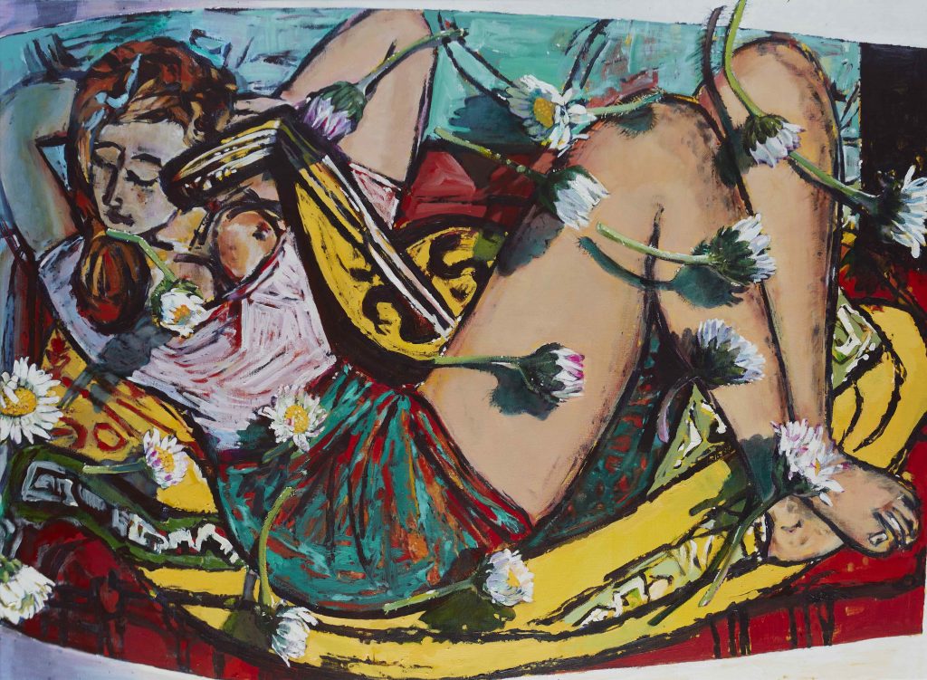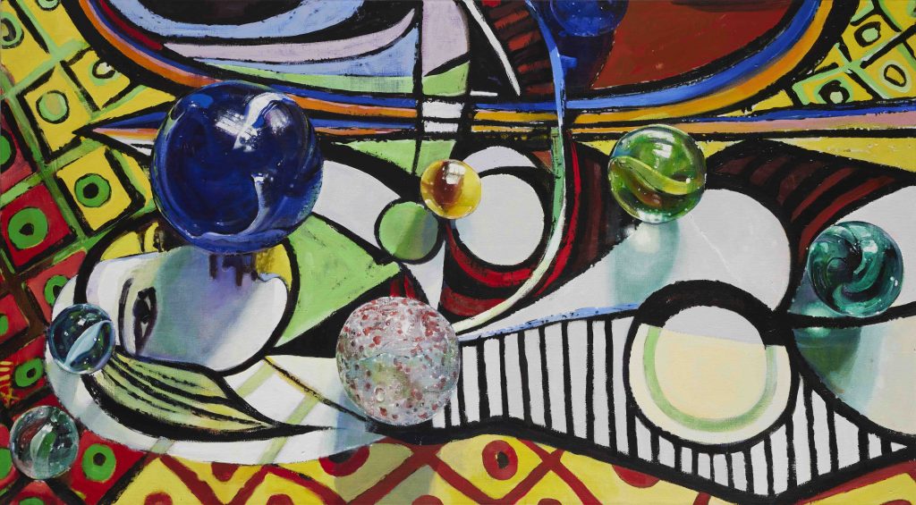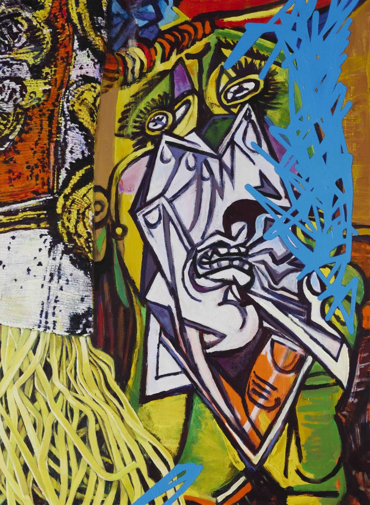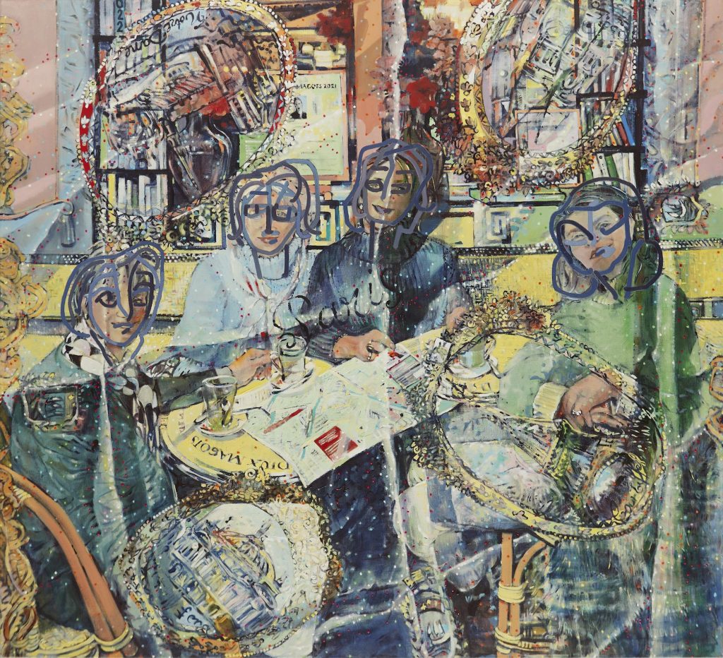 Hanneke Gommers durft het leven te vieren in haar schilderijen. ‘Ik kan heel slecht stoppen als ik met mijn werk bezig ben. Als ik niet schilder word ik ziek. Ik ga maar door. Alles wat ik doe integreer ik in mijn werk. Ik heb op mijn mobiele telefoon een teken-app waar ik vaak mee zit te spelen. De tekeningen die ik zo maak, neem ik weer op in mijn schilderijen als decoratieve patronen die kunnen contrasteren met de bestaande schilderijen die ik gebruik. Zo heb ik ook de stof van een jurk die ik draag verwerkt in een bewerking van een portret dat Picasso schilderde van zijn muze Dora Maar. Ik bestrooi mijn doeken gerust met snoepjes van Haribo of met knikkers, in geschilderde vorm natuurlijk, om het bestaande beeld te verstoren of in ieder geval op een andere manier te laten zien. Als ik met vriendinnen naar Parijs ga, bezoeken we beroemde historische plekken zoals het legendarische kunstenaarscafé Les Deux Magots. We hebben daar een groepsfoto laten nemen waarvan ik een schilderij heb gemaakt. Als voorstelling is dat groepsportret dan wel aardig, maar om er een goed schilderij van te maken moet ik er nog wel een draai aan geven. Daarvoor heb ik een doorzichtige shawl met afbeeldingen van toeristische Parijse bezienswaardigheden over het doek geschilderd. De herkenbaarheid van mijn vriendinnen is dan ver te zoeken, maar het gaat me toch om de ontregeling die ik schilderkunstig teweeg kan brengen. Wij zijn niet de eersten en niet de laatsten die het leven en de kunst ondergaan in Les Deux Magots.’