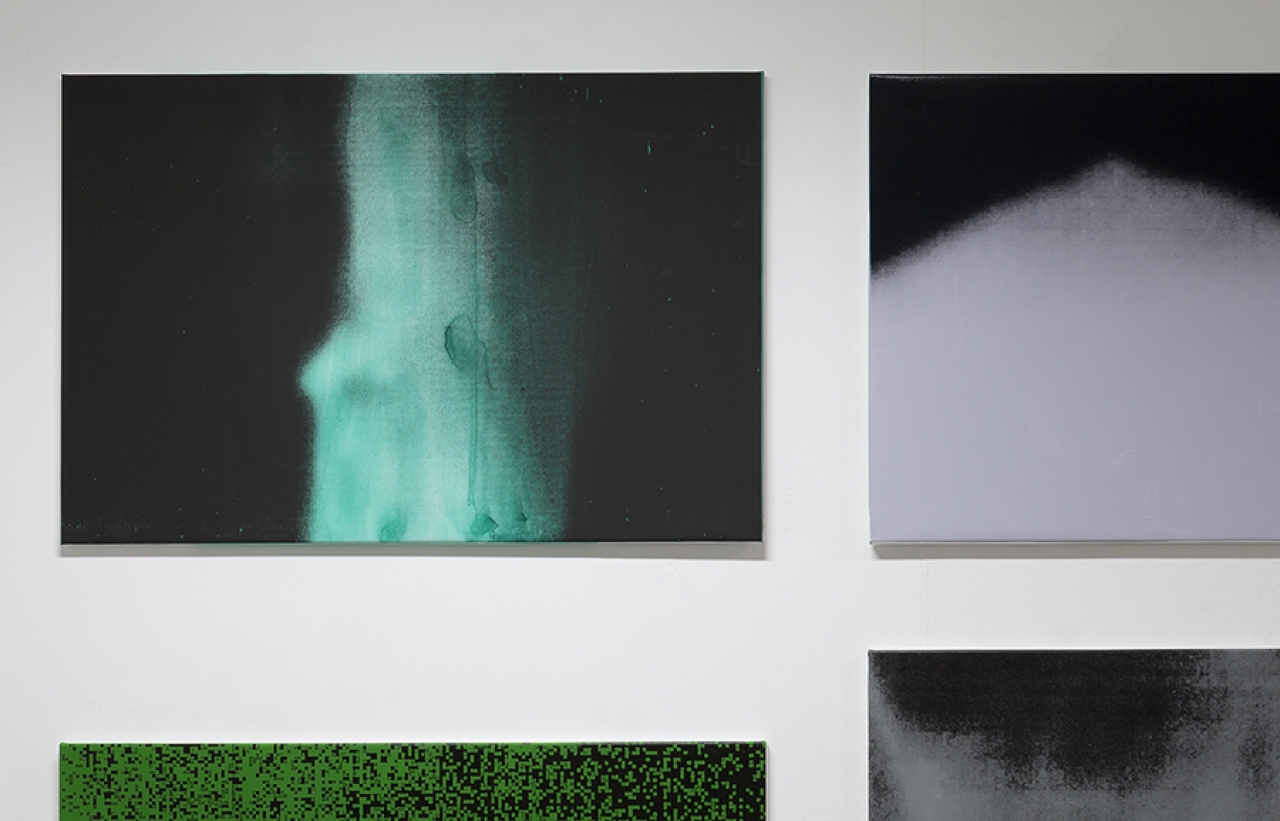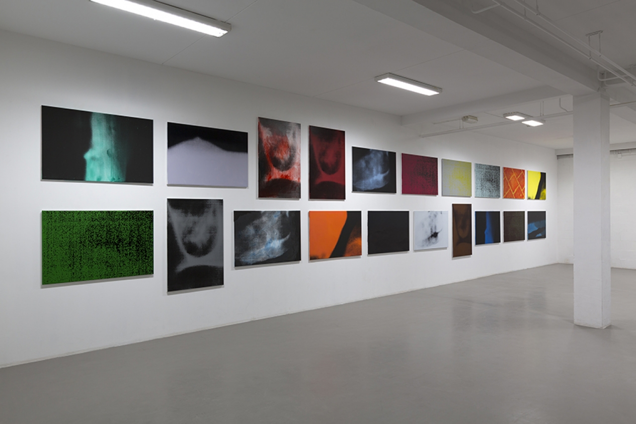 Beeldend kunstenaar Christine Moldrickx maakte verschillende werken met een infraroodlamp. Zo hing ze een warmtelamp boven een kartonnen doos met een smoezelige krant op de bodem. Het werk heet Vogelbox (2012). Op de krant is een lichtroze lichtplek zichtbaar waar mogelijk een vogel in de warmte heeft gelegen. Of misschien zelfs een ei heeft warm gehouden? Twee jaar geleden hing Modrickx een warmtelamp laag bij de grond, middenin de verdonkerde ruimte van Punt-WG in Amsterdam. Een donkerrode gloed verspreidde zich door het duister. Een vervolgstap van dit project was afgelopen maand te zien in galerie P/////AKT. Op basis van een serie warmtefoto’s besloot Moldrickx zelf kleurinterpretaties te geven aan de door haar vastgelegde warme lichaamsvormen. Dat resulteerde in het werk Herzschritt (Pace) Macher (Maker) (2021). Twintig grote zeefdrukken op canvas vertonen niet de standaard kleuren om warmte aan te duiden, want paars komt helemaal niet voor en geel maar één keer. Toch zijn de afbeeldingen stuk voor stuk herkenbare afdrukken van warme, plakkerige holtes die broeierig gloeien.