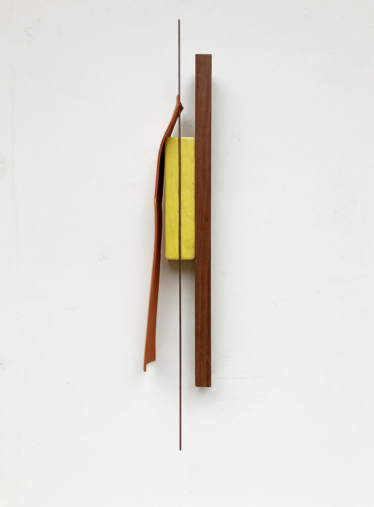 ‘Sinds ik in Groningen woon, werk ik niet meer in opdracht, maar ben ik vrij werk gaan maken. Daarbij gaat het erom dat ik de beperkingen die ik mezelf opleg loslaat door voortdurend een andere oplossing te zoeken. Nu zijn het nog werken aan de wand, maar ik probeer ze vrijstaand te maken. Het beeld moet op zichzelf staan, al is het ergens aan ontleend. Het is in beweging. De objecten met gele en bruine houtblokjes die ik heb gemaakt zijn ontstaan vanuit het huis waar ik nu woon. Ik heb de blokjes hout hier gevonden en er een verstandhouding mee gezocht. Het is een waardevol gevoel dat ik niet stilsta, maar iets ontwikkel met wat ik ter plekke aantref. Ik zoek een ander perspectief binnen het bestaande. Ik maak wel iets dat er eerst niet was. Dat is een verschil met decorontwerp, wat een afgerond proces betreft dat kan worden gearchiveerd. Ik verbind me nu steeds met het volgende wat ik nog ga maken. Ik maak mijn eigen denkproces waarneembaar. Een decor begint met een leeg toneel en eindigt met een ingevuld toneel. Mijn vrije werk ontstaat uit een gedachtestroom die voortbeweegt. In mijn hoofd weet ik welke stappen ik ga maken.’