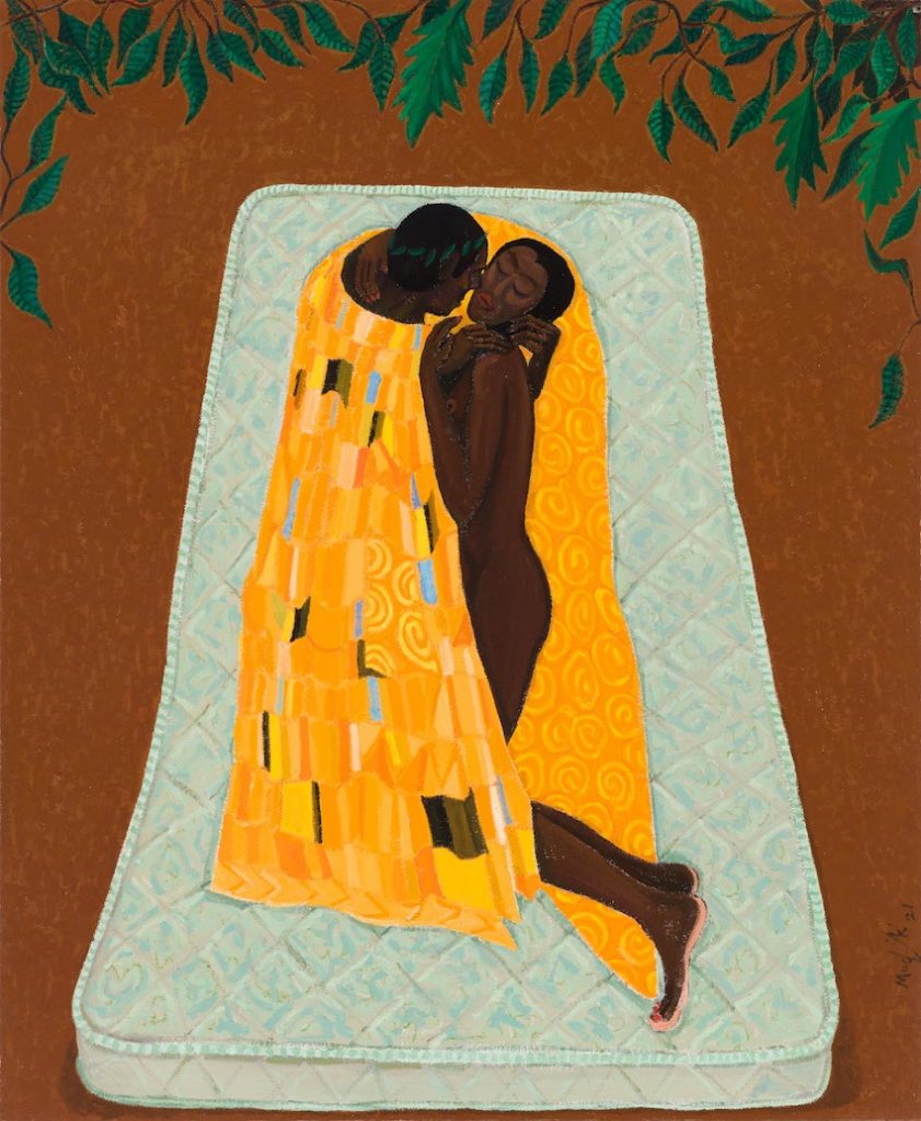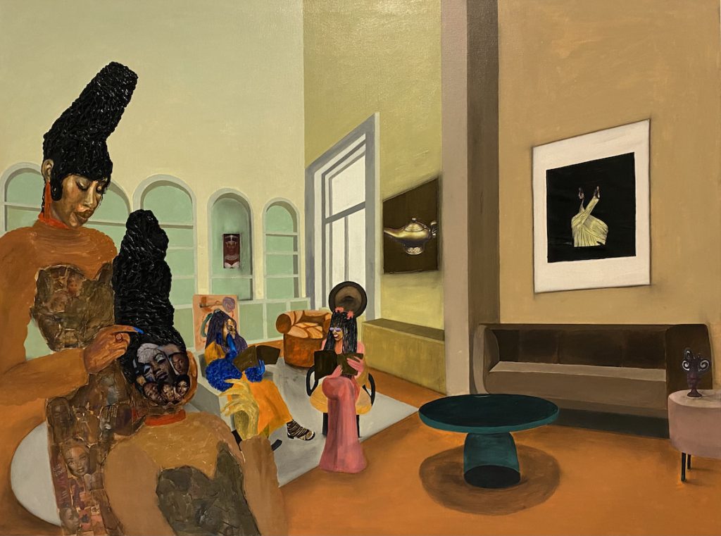 Dat is wat ze hier ook voelt, in deze mega-hal, in de kleinere expositieruimtes: elk kunstwerk laat een sprankje van een mens zien, van landen, een bevolkingsgroep, een subcultuur, een (soms te weinig gehoorde) proteststem. ‘Daarom vind ik het denk ik zo fijn dat er zo veel ménsen te zien zijn.’ Marian gaf in eerdere interviews aan dat ze het belangrijk vindt dat mensen van kleur niet alleen maar als tot slaaf gemaakte worden afgebeeld, maar zoals ze daadwerkelijk zijn. ‘En dat ze ook zijn gemaakt door mensen van kleur’, vult ze aan, ‘daardoor voel je de oprechtheid van de boodschap van de maker.’ Het doet haar, als ze even vrij mag associëren (ja dat mag) denken aan een tentoonstelling in 2020, We Will Be Here Forever, Do You Understand?, waarin OSCAM samen met Lee Stuart en Esmeralda Violette van Patta jonge kunstenaars van kleur centraal stelde, onder wie de Rotterdamse Shertise Solano, van Antilliaanse afkomst. De boodschap die werd uitgedragen: wij zijn hier, wij gaan niet weg, dit zijn wij. ‘En dat’, zegt Marian, ‘dat voel ik ook een beetje als ik naar al deze werken kijk. Het zijn er zo veel, ze zijn zo mooi, zo krachtig… Nee. Om deze kunstenaars kun je niet heen. En om ons kun je ook niet heen.’