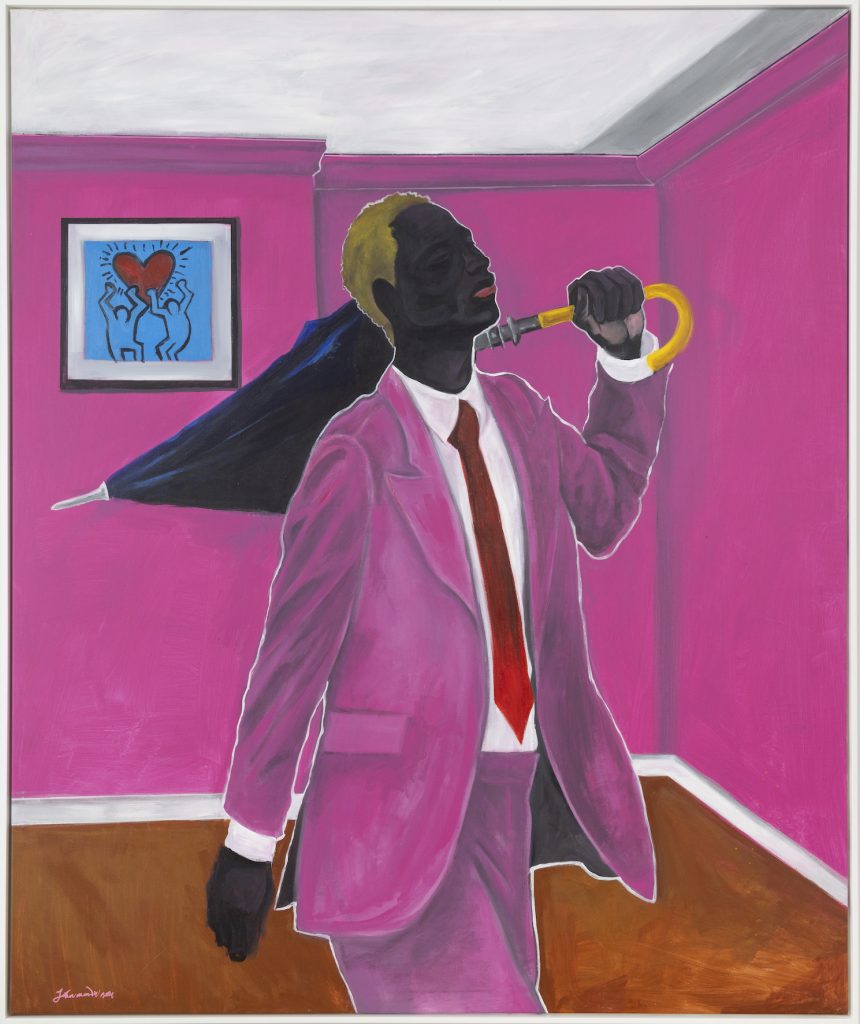 Behalve dan dat het schilderij geen gezichten kent, geen neuzen, monden, sprekende ogen, oren, is het ook een vreemde eend in deze bijt vanwege de kleuren. Of, liever gezegd: het gebrek eraan. Voor de rest is het hier, in deze hal, door de aanwezigheid van al deze werken, een behoorlijk bonte bedoening. ‘Deze hier, práchtig, en grappig, het gaat over de weather man!’ John Madu, een kunstschilder uit Nigeria, schilderde een man met een paraplu, in een – wederom knallend – roze pak. Het is een luchtige verwijzing naar de regenmaker, weet Marian, die in bepaalde bevolkingsgroepen in Nigeria zegt macht te hebben over het weer en regen te kunnen ‘maken’ zodra hem dat wordt gevraagd in tijden van extreme droogte.
