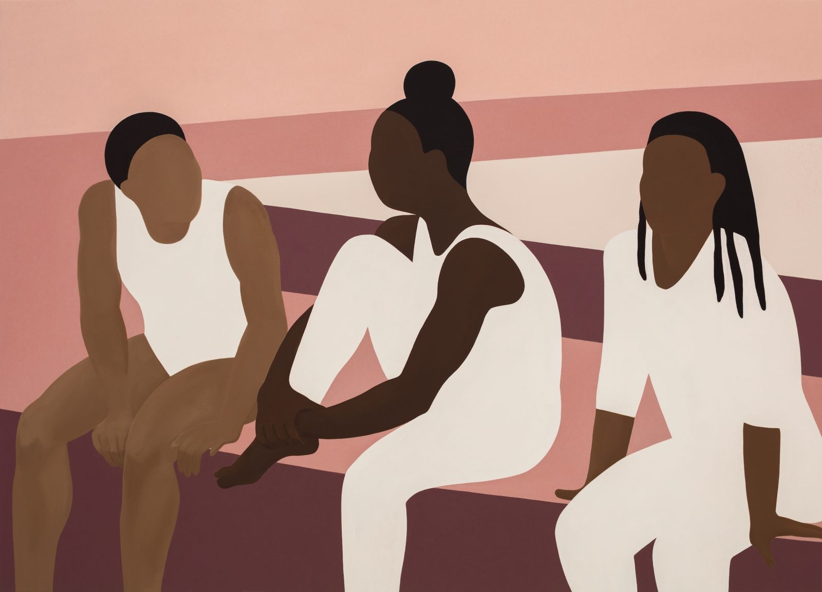 Ze wijst naar het werk van een Zuid-Afrikaans-Amerikaanse kunstschilderes Thenjiwe Niki Nkosi, die een serie maakte over het onderwerp gymnastiek. Op het werk waar Marian naar kijkt, in enkel beige, witgeel en bruintinten, zitten drie meisjes of jonge vrouwen op een bankje. Ze hebben geen gezicht, dat is het eerste dat mij opvalt. Maar Marian ziet wat anders. Hun houding. ‘Die twee praten met elkaar. Die ander niet, die zit een beetje verder van ze af, kijkt voor zich uit. Ik vind het… Ja. Het doet iets met me. Ik vraag me af hoe zij, ervan uitgaande dat ze zich identificeert als vrouw, zich voelt. Of ze zich buitengesloten voelt. En of ze happy is.’