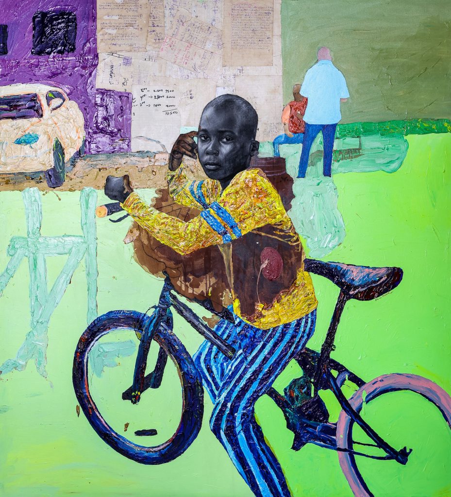 De tentoonstelling toont 145 werken van 135 verschillende kunstenaars uit 33 Afrikaanse landen, alle werken zijn voorzien van een begeleidend tekstje met uitleg over wat we zien en wie het maakte. Zoals My Favorite Albert’s Theory van Emma Odumade (2000), een kunstenaar die met potlood en houtskool het leven van mensen in zijn geboorteland Nigeria schetst. De achtergrond is knalgroen. De voorgrond toont een dagelijks tafereel, er zit een jongetje op een blauwe fiets. ‘Hij doet me denken aan mijn zoon Jaden’, glimlacht ze. ‘Die kan ook zo op z’n fiets chillen.’ Naast het schilderij staat uitgelegd: ‘In zijn werk bevraagt Emma Odumade de constructie van identiteit en verkent hij de sociale constructies van schoonheid en macht.’ Marian blijft hangen bij die twee woorden. Schoonheid en macht. ‘Alles wat hier hangt, is schoonheid. Maar bij het woordje macht moet ik ook denken aan wat ik voelde toen ik las dat het hier gaat om kunst van jonge mensen van kleur, die is verzámeld door twee witte mensen… Het geeft me een beetje een ongemakkelijk gevoel. Ik twijfelde daarom ook of ik ‘ja’ moest zeggen op dit interview. Wil ik dit doen? Ik wil daar wel eerlijk over zijn tegen je. Ik zie wel dat het een heel gevarieerd, diverse verzameling is, dat vind ik echt heel goed en mooi dat ze hun werken delen, maar ik had het denk ik toffer en prettiger gevonden als hier kunst had gehangen die was verzameld door een gemêleerder gezelschap. Maar tegelijkertijd was ik wel heel nieuwsgierig. Want het is hier’– ze wijst even om zich heen, in de hoge hal – ‘gigántisch.’