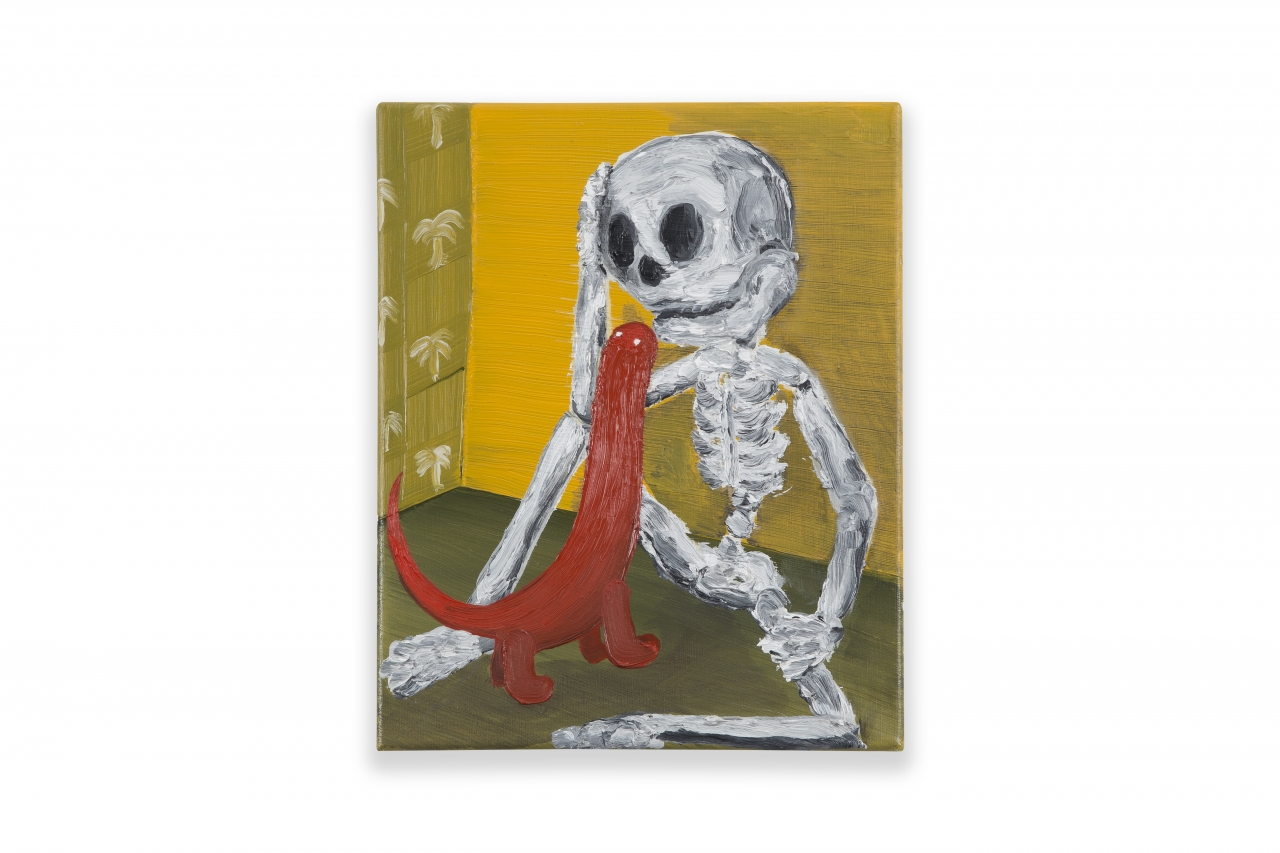 Duijf citeert niet alleen genretaferelen, hij haalt ook figuren aan uit lang vergeten volks folklore. Zo is zijn Vlezige schedel verwelkomt de aasgieren met zijn smakelijke glimlach een ode aan de snaakse Pierlala: Het bijdehante figuurtje uit Zuid-Nederlandse volksliedjes. Deze brutale vlegel laat zich begraven om uit het leger te komen om daarna vrolijk uit zijn doodskist te klimmen en mee te tetteren op zijn eigen begrafenisfeest. Op een slap geschilderd bordje ligt een grijnzende doodskop als etenswaar uitgestald. Rondvliegende aasgieren doen zich tegoed aan de laatste restjes vlees die nog op de schedel kleven. Ook hier is de verf weer pasteus aangebracht zodat het roodbruine vlees klonterig op het bot lijkt te liggen. De voorstelling is zowel macaber als humoristisch, we zien een doodskop als het vrolijke restant van een feestmaal. Het leven is met smaak verorberd en de grijnzende Pierlala heeft dezelfde genotzuchtige boodschap als al die anderen. Hij demonstreert vol verve dat we, corona of niet, allemaal binnen afzienbare de pijp uit gaan. Dus laten we het ervan nemen zolang het kan en genieten van de kleine geneugten die het leven ons biedt. Een luchtig en bemoedigend devies in deze angstige tijd waarin we allemaal noodgedwongen op de rem moeten staan. Er komt ooit weer een dag om te plukken, zoveel is zeker volgens Duijf.