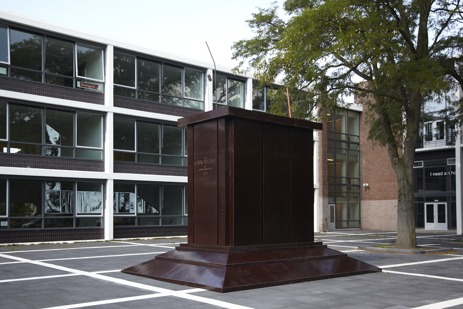In 2012 exposeerde Harold de Bree op het voormalig schoolplein van de Haagse broedplaats Platform57 met een werk dat hij baseerde op het ruiterstandbeeld van Willem II dat in Den Haag prominent op het Buitenhof staat. De Bree kopieerde de sokkel van het ruiterstandbeeld, maar liet het beeld van Willem II achterwege. Zijn versie vervreemd, de sokkel oogt te nieuw en te schoon om te vermoeden dat het beeld van Willem II er door een massa vanaf is gehaald, maar tegelijkertijd is hij onbruikbaar als eremonument door het ontbreken van de sculptuur op de sokkel. De Bree’s versie van de sokkel roept niet alleen vragen op over de afwezigheid van het standbeeld, het bevraagt ook de reproduceerbaarheid en tijdelijkheid van het monument. ‘Zijn’ Willem II is een replica van een replica: het ruiterstandbeeld dat op het Buitenhof staat is namelijk ook een kopie: het origineel staat in Luxemburg. Oorspronkelijk stond er op het Buitenhof een beeld van een staande Willem II, tot deze in 1924 vervangen werd door het huidige ruiterstandbeeld. Tilburg kocht het oorspronkelijke werk, waar het tot op de dag van vandaag op het Heuvelplein staat. Zelfs standbeelden hebben een houdbaarheidsdatum, zo blijkt uit de voorgeschiedenis van dit ruiterstandbeeld. Binnen het publieke debat is het opvallend stil wanneer een standbeeld verwijderd wordt om esthetische redenen – blijkbaar dreigt geschiedenis volgens tegenstanders pas ‘uitgegumd’ te worden wanneer de roep om verwijdering voortkomt uit humanitaire overwegingen.