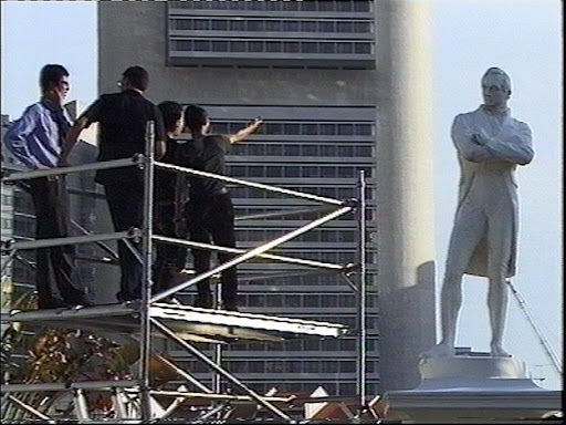 Beelden van koloniale bezetters zijn niet alleen besmuikt met schaamte in hun thuisland. Ook in de door deze figuren onderdrukte gebieden zijn standbeelden opgericht (vaak door henzelf of door hun regering) ter nagedachtenis aan hun invloed op de specifieke plekken. De Britse kolonist en luitenant-gouverneur Thomas Stamford Raffles ging de geschiedenisboeken in als de oprichter van het moderne Singapore. Er staan twee standbeelden ter ere van Raffles in de stadstaat: één klassiek uitgevoerd bronzen beeld waarvan de presentatie de symbolische afstand tussen de figuur Raffles en het volk vergroot, door middel van de traptreden waarop de grote, stenen sokkel zich bevindt en het sierhek dat om het geheel heen is geplaatst. Zeven jaar na Singapore ‘s onafhankelijkheid, in 1972, werd een kunststenen kopie van het standbeeld geplaatst op het naar Raffles vernoemde plein waar hij in 1819 voor het eerst landde. Het nieuwe beeld behield zijn menselijke formaat en de sokkel van deze nieuwere versie is ingetogener, ‘bereikbaarder’. Toch kijkt Raffles nog steeds met zijn armen over elkaar heen geslagen neer op de bewoners van zijn voormalige kolonie vanaf een twee meter hoge sokkel. Kunstenaar Lee Wen kwam met een simpele, maar effectieve oplossing die zorgde voor een meer gelijkwaardige interactie tussen de bewoners van zijn thuisstad en het beeld. Hij plaatste een bouwsteiger tegenover het monument, waardoor bezoekers oog in oog kwamen te staan met de figuur die tot dan toe altijd op hen neergekeken had. Wen creëerde hier met een simpele ingreep een setting waarin de bezoeker haar koloniale verleden in de stenen ogen kon kijken.