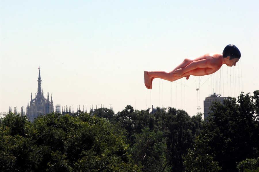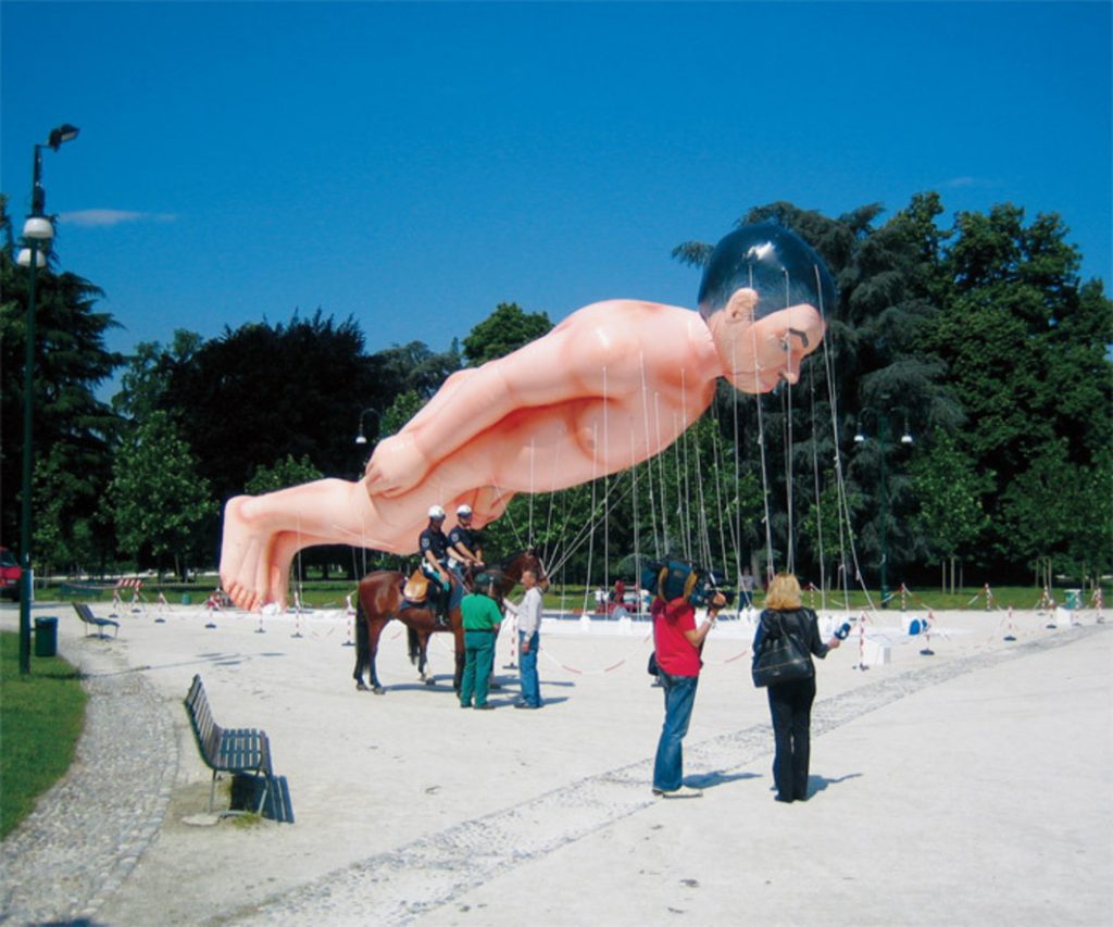 De impact van het voetstuk en de keuze voor zware materialen voor het standbeeld worden pas echt duidelijk wanneer beiden afwezig zijn. De Poolse kunstenaar Pawel Althamer richtte een standbeeld van zichzelf op in de openbare ruimte en koos voor een tegenovergestelde aanpak dan de traditionele beeldhouwwerken in de openbare ruimte. Geen graniet of brons vult zijn beeld, maar lucht. Geen massieve sokkel, maar de zwaartekracht verheft dit beeld boven de toeschouwer. Een beeld van dit formaat was in natuursteen, verticaal op een sokkel geplaatst, een intimiderend gezicht geweest. In de vorm waar Althamer voor koos is het beeld niet minder indrukwekkend, maar de emotie die het teweegbrengt is van een totaal andere orde. Zo’n grote roze luchtballon is indrukwekkend zoals een circusact indrukwekkend kan zijn in zijn absurditeit en hilariteit.