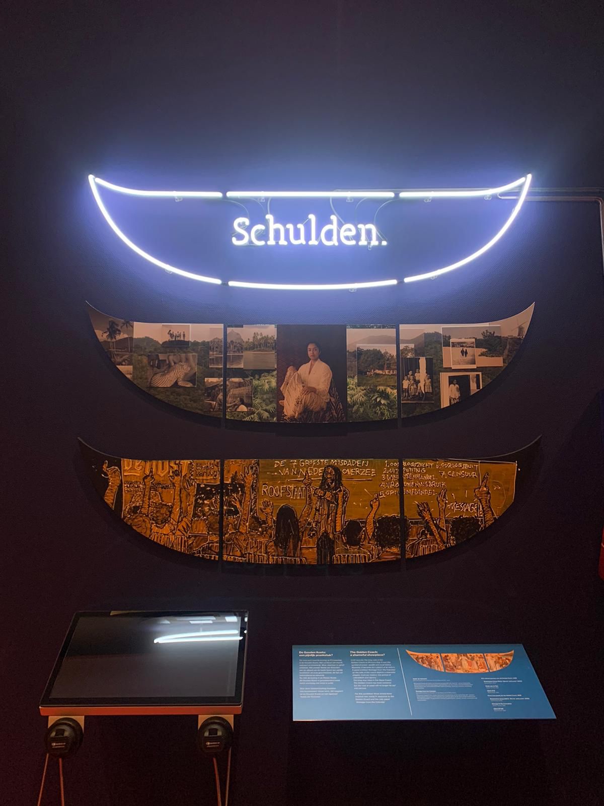 Ik hou van het nadenken over hoe je beelden in woorden kan vatten. Het werk wat ik nu in het Haags Historisch Museum heb, is een mooi voorbeeld van spelen met taal. De tentoonstelling Macht, 800 Jaar Binnenhof gaat over de ontwikkelingen van het Binnenhof. Samen met Amber Toorop en Brian Elstak ben ik gevraagd om een werk aan te leveren dat reflecteert op het zijpaneel De Hulde der Koloniën van de Gouden Koets. De stad Den Haag is gegroeid vanaf het Binnenhof omdat er kooplieden en ambachtslieden naartoe zijn getrokken. Een van de ambachten die ze in Scheveningen hebben is neonlicht maken en dat doet het bedrijf Neon Lewa. Met die ambacht in gedachte ben ik gaan nadenken over het woord “hulde”. Wanneer je daarmee speelt kom je erachter dat “hulde” ook in het woord “schulden” zit. Toen heb ik dus een omtrek van het paneel van de koets in neon neergezet waarbinnen het woord “schulden” wordt afgewisseld met “hulde”. In de omtrek van dat paneel samen met de wisselende woorden, kan er zoveel meer gezien worden. Woorden geven zo een hele mooie ingang tot een verandering.