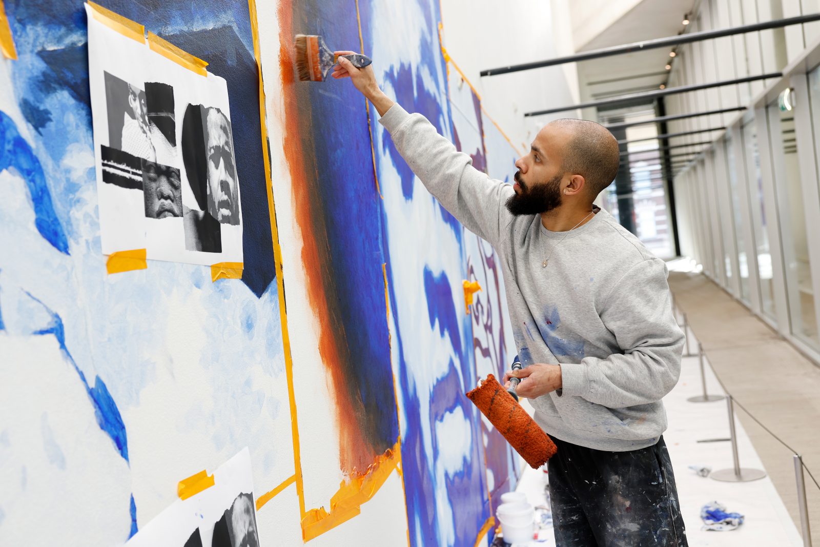 Leana Boven bekijkt met bezoeker Jaimy de muurschildering The Revisitation van Dion Rosina in de Kunsthal. Rosina engageert zich met historische vertellingen en mythologieën, die hun oorsprong vinden in de Afrikaanse diaspora. Hij werkt hiervoor met archiefmateriaal en legt vanuit zijn eigen positionering verbanden bloot die hij weet vast te leggen in onder andere collages. ‘De tijd vraagt erom dat je als persoon van kleur bezig bent met je roots en dieper in jezelf kijkt. Ik denk hier veel over na.’
