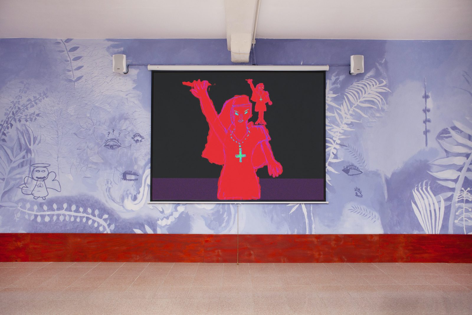 Ook in Adoration, een filmisch werk met realistische, echte beelden en abstracte, staan vrouwen centraal, namelijk die in een Venetiaanse vrouwengevangenis. De film die in de met tralies en ramen behangen kamer wordt getoond, gaat over de geschiedenis van de gevangenis in de zestiende eeuw, toen het gebouw nog een klooster was. De beelden gingen vorig jaar tijdens de Biënnale van Venetië in première en zijn nu voor het eerst in Nederland te zien. Hier, dus, en, noemenswaardig detail: we bekijken de film het ook in een voormalig klooster, want daarin is het museum gevestigd. Glas-in-loodramen en hoge plafonds verraden deze herkomst. De vrouwen in het Venetiaanse klooster werden gevangengehouden en gedwongen te leven als non, omdat ze bijvoorbeeld prostituee waren. ‘Oh, ik wilde deze film al héél graag zien’, roept Nina, ze gaat zitten en is meteen gegrepen door beelden van nonnen die toch ook weer eng aandoen, alsof ze geestverschijningen zijn, afgewisseld met vrolijke, vuurrode getekende nonnetjes, haast psychedelisch weergegeven, fluorescerende kleuren, snelle beelden, die verwijzen naar het jaarlijkse toneelstuk dat de nonnen in de zestiende eeuw opvoerden voor de bewoners van de stad. Ze verkleedden zich in de mooiste kostuums, deden zich voor als edelmannen en priesters – wéér die speling met gender, tóén al. ‘Ik heb al een artikel over dit kunstwerk naar mijn artistiek leider gestuurd’, zegt Nina. Ze fluistert een beetje, er zit een vrouw naast ons. ‘Hier zit een voorstelling in. Hier móéten we iets mee. Zo vet. En zo’n verademing. Die vrouwen zijn alles in één. Ze zijn prostituee, non, een keer per jaar man. Fluïde. Ze zijn gevangen, en vinden vrijheid in het performen. Ja. Vet.’ Dan, lachend, kijkend naar de vrouw die binnen één minuut weer weg is. ‘Niet iedereen kan dit waarderen. Het is enerzijds best expliciet, vrouwen die hoer waren en daarna non, en anderzijds heel vaag – want wat zíjn ze nou. Mensen houden toch van hokjes, als houvast.’