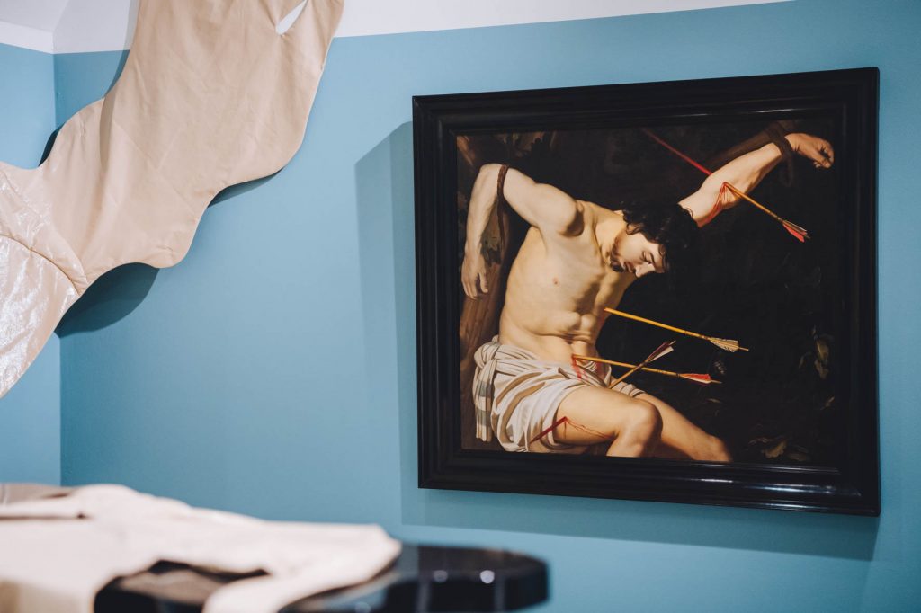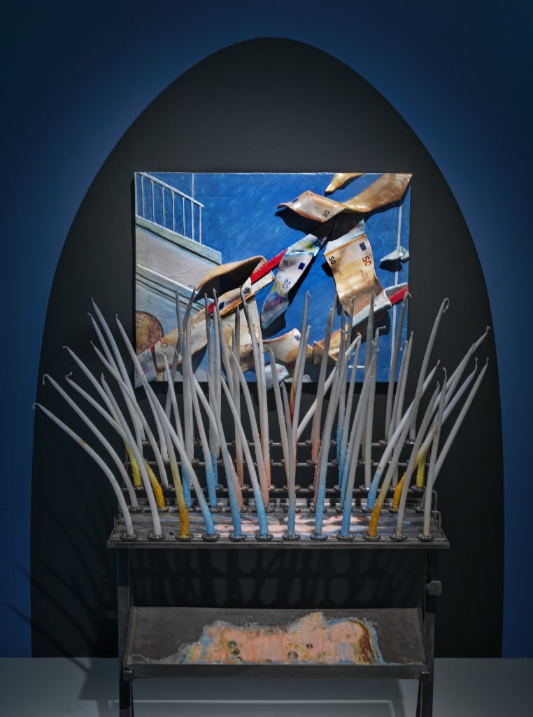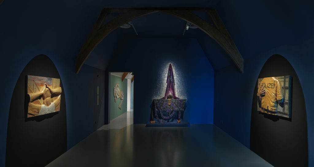 We lopen naar het altaar, dat geen Mariabeeld bevat maar een pruik (en geslachtsdelen van een vrouw, maar ook dat zagen we later pas). Pauline Curnier Jardin weet ons in deze eerste ruimte al te verrassen met kunstwerken waar we bij staan, en naar kijken, en nog eens goed naar kijken en denken: héé.