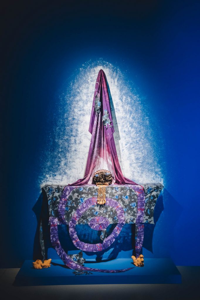 ‘Zálig’, zegt Nina Spijkers bij binnenkomst in de eerste ruimte van de tentoonstelling op de tweede verdieping van het Centraal Museum. En dan ook zalig met een langgerekte ‘a’ gevolgd door een diepe oplucht-zucht, alsof ze thuiskomt van een drukke werkdag, joggingpak aan, dat idee. Waarom Nina het zálig vindt: de volledigheid van de ruimte. Er hangt een religieuze sfeer, er staan (niet-brandende) kaarsen, er is een donkerpaars altaar. Maar er is niet alleen aan de inrichting gedacht, waar hangen of zetten we wat, nee: er klinkt ook unheimische muziek, of meer vreemde klanken, het ruikt er ‘een, eh, ja, beetje muffig’ en het is er op sommige plekken mystiek donker – ‘een goed lichtplan’, zegt ze. En dat zegt wat, uit de mond van een theatermaker.