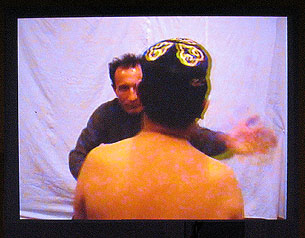 Na het uiteenvallen van de Sovjet-Unie ontstonden er vijf nieuwe ‘stans’.[1] In het begin was iedereen in de war door deze nieuwe formaties. Ik heb deze onbepaalde tussentoestand en tijd een naam gegeven: pa-stan. In 2001 maakte ik het eerste deel van een serie werken genaamd Pastan. In deze videoperformance wordt er een personage, gespeeld door mijzelf, in het gezicht geslagen en overladen met verbaal geweld. Hij ondergaat het zonder actie te ondernemen. Op een gegeven moment vangt hij wel zijn tubeteika, een Kazachse vilten muts, die na een bijzonder harde klap van zijn hoofd is gevallen. Deze muts verschijnt als een soort rode draad in alle latere werken in de Pastan-serie, die tot op heden vier films omvat. De films zijn volgens hetzelfde schema opgebouwd en lijken op een soort videoportret van mij, de kunstenaar, die recht voor de camera of de toeschouwer zit. In het tweede deel, Shu-chu (2007), lacht het personage onophoudelijk en imiteert het mechanische gelach van een Chinees speelgoedkatje. In de derde film Allergy (2009) wordt er gehuild; in de vierde, Spit (2014), bedekt het personage zijn eigen gezicht met spuug: speeksel loopt langs een onzichtbare glasplaat tussen de camera en het personage, waardoor zijn gelaatstrekken geleidelijk vervagen. Deze laatste video verwijst tegelijkertijd naar de eerste: het demonstreert een andere versie van (zelf-)vernedering. In Pastan I (2001) wordt het personage geslagen en vernederd door een ander. Deze ander is te zien op een tweede scherm, waar de gebeurtenissen vanuit het tegenovergestelde perspectief worden getoond, wat lijkt te wijzen op een omkeerbaarheid van dader en slachtoffer positie. In Spit (2014) combineert het personage beide rollen. Het misbruik in de Pastan-serie staat symbool voor wat mensen in Centraal-Azië ondergaan door politieke regimes die met geweld en angst de macht proberen te houden. In de films toon ik een soort oer-emoties: pijn, lachen, huilen, vernedering. Zo demonstreer ik een soort oer-staat. Ik plaats mezelf op één lijn met andere levende wezens en, tot op zekere hoogte ook met levenloze objecten.