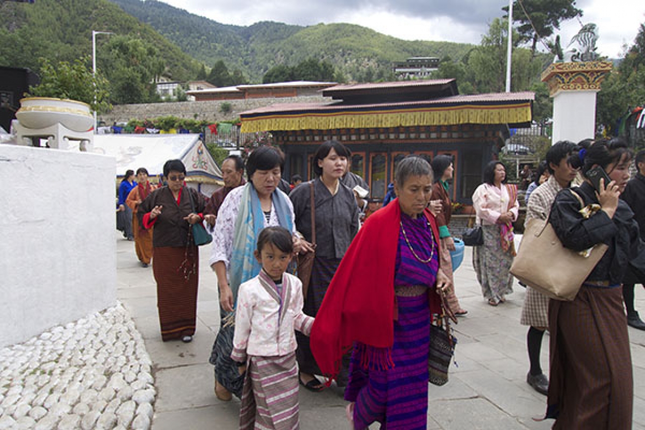 In 1989 bepaalde de eerste moderne ‘driglam namzhag’ dat de inwoners van Bhutan voortaan de nationale kleding moeten dragen op publieke plekken, scholen, werk, in tempels en bij officiële gelegenheden. ‘Please come in formal dress.’ Toen we per ongeluk de finale van Idols binnenliepen zat iedereen op plastic stoeltjes naar de optredens te kijken, allen gekleed in de traditionele gho en kira (en met het lieve hoofdje van het pasgeboren prinsje Gyalsey als centrale focus op het achterdecor).