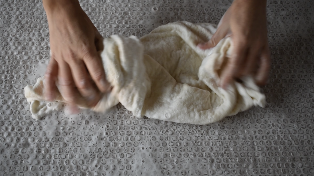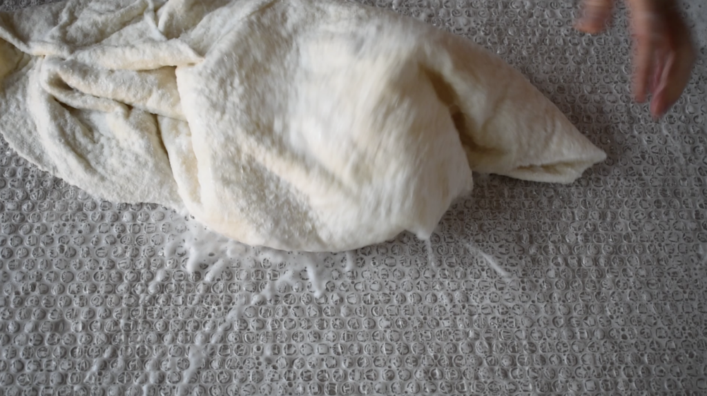 Bij het vervilten van schapenwol bijvoorbeeld, vertelt de textuur van de wol die mijn handen aanraakt wat de volgende handeling moet zijn, en wanneer deze kan plaatsvinden. Of bij de verwerking van vlasplant tot linnen, waarin een rottingsproces dat ‘roten’ genoemd wordt een belangrijke stap is. Door de uitgebloeide vlasstengels op het land te leggen, zorgt de blootstelling aan vocht ervoor dat de houtige delen van de vlasstengel loskomen van de flexibele lintvezels. Om te bepalen wanneer het vlas van het land gehaald mag worden, kun je een stengel tussen beide duimen en wijsvingers vastpakken en in tegengestelde richting draaien. Je weet wanneer het ideale moment is aangebroken als de kern van de stengel al wel breekt, maar de lintvezels nog niet.