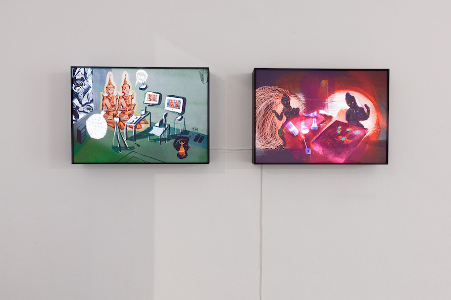 Hier, ik kan je de schetsen laten zien die ik toen maakte – deze is uiteindelijk in TENT komen te hangen. Ik gebruik deels digitale en deels originele tekeningen die ik via een app samenvoeg. Het is een nabootsing van mijn studio bij het Piet Zwart Institute. Je ziet het raam, het kastje, een draaitafel. De beelden die ik erbij heb getekend zijn Apsara’s, dansers uit de Zuidoost-Aziatische mythologie. Je ziet ook een Malagassisch dier, een indri, dat is een zonaanbidder, en luli, een moederfiguurbeeld uit de Molukse cultuur. Dat zijn allemaal elementen die ik ben tegengekomen; mijn partner heeft een speciale app gemaakt waarin ik alles in opsla, zonder label, om er later inspiratie uit te putten. Op de andere tekening in TENT zijn naast Apsara’s ook traditionele muziekinstrumenten te zien, en een nagetekend portret van een onbekend gezin tijdens de Khmer Rouge.