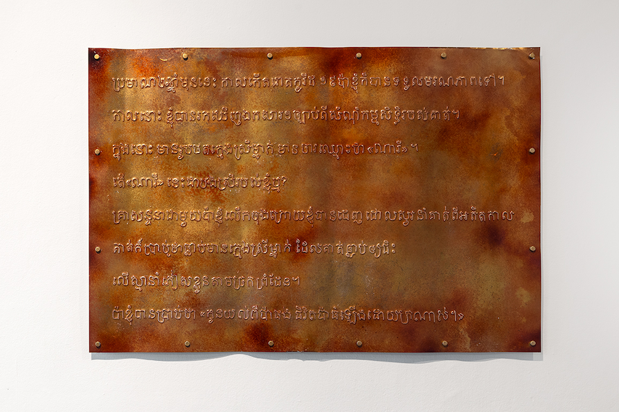 In het werk Tails of the Past vertel je hierover, met een inscriptie in het Khmer. Het is een aangrijpend persoonlijk verhaal, over de verloren familie van jouw ouders, en jouw eigen worsteling om hiermee om te gaan. Hoe kwam dit tot stand?