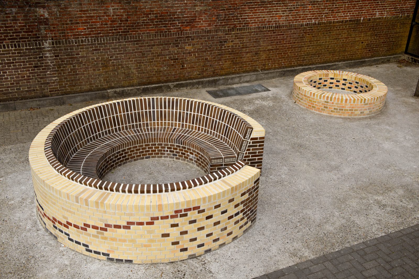 Een ander bruggetje, nu een letterlijke: de Kwekersbrug. Die steken we over op zoek naar Baukje Trennings Onder gelijken – cirkels van baksteen (2022). ‘Van deze hoop ik het meeste dat die blijft staan,’ zegt Koen wanneer we ‘m hebben gevonden. We bevinden ons op een voormalig industrieel terrein waar een schoorsteen van een oude zeepfabriek nog aan herinnert. De stenen voor de folly lijken op een bepaalde manier op die van oude schoorstenen, vertelt Koen terwijl hij me wijst op de ‘radiaalstenen’, die taps toelopen. We lopen eromheen en bij het betreden van de cirkel valt op hoe, bij de uitsparing van de cirkel, de zijkanten van de stenen zichtbaar gehouden zijn. Hierdoor zie je dat het strengpersstenen zijn, gemaakt door de klei door een vorm te persen waardoor er gaten in ontstaan, die je normaal niet ziet. De stenen zijn daardoor lichter, strakker, en drogen regelmatiger voor ze in de oven gaan. We nemen erin plaats en Koen vertelt onder meer over de stand van het metsel-onderwijs. De akoestiek in de cirkel is opmerkelijk, ondanks dat die niet veel hoger is dan een normale rugleuning, horen we elkaar bijzonder goed. ‘Ik voel me omarmd en afgeschermd,’ laat hij zich ontvallen.