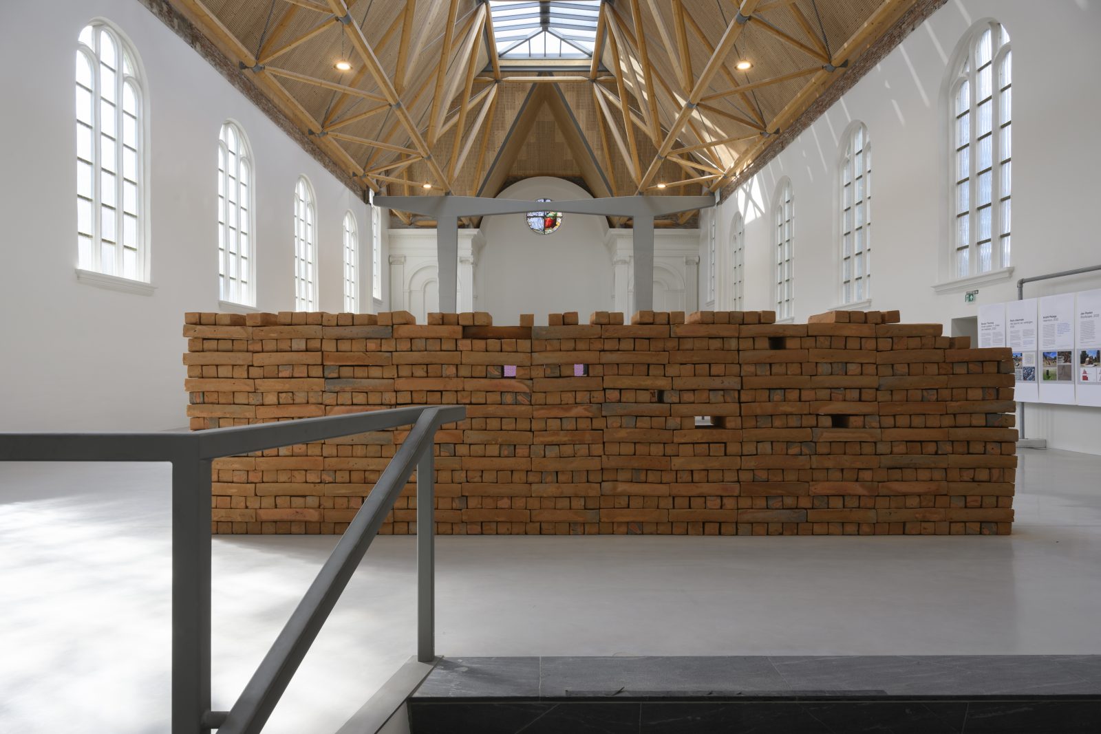 Voordat we de kerk verlaten, staan we even voor een muur van Bosco Sodi, Muro. Het werk werd voor het eerst uitgevoerd in Washington Square Park in New York in 2017, ten tijde van Trumps presidentschap. Het was een sculptuur, performance en aanklacht tegen Trumps plannen voor de muur tussen de VS en Mexico. Mensen konden er elk een steen, gemaakt in de studio van de kunstenaar in Oaxaca, verwijderen en zodoende werd de muur ontmanteld. Hier in de Elleboogkerk kunnen bezoekers een steen meenemen tegen een donatie, het bedrag gaat naar Human Rights Watch. Ik bestudeer de kleurschakeringen op de stenen en Koen legt uit hoe die ontstaan bij het bakproces, door minder zuurstof in de oven te laten. Hij geeft me een voorbeeld van wat blijer stemmende muren: slangen- of slingermuren die extra schaduw, afscherming voor de wind, of juist warmte absorberen en teruggeven, waardoor uiteenlopende planten en gewassen er goed gedijen.