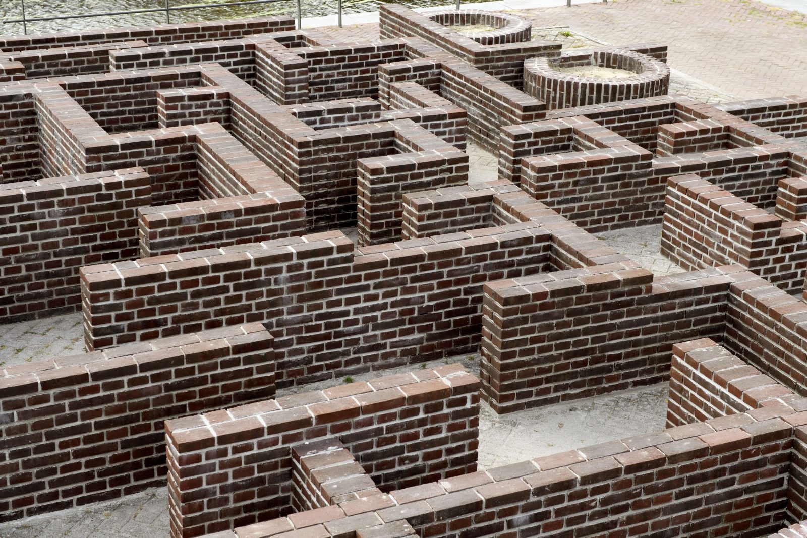 Inmiddels staan we voor Het Labyrint van Verlangen (2022), de folly van Floris Alkemade. Het is een stenen doolhof – de plattegrond ontleend aan die van een IKEA – opgetrokken in kleine muurtjes in verschillende hoogtes. Op dat moment zit er een groepje mensen midden in het labyrint. Het blijkt, mits je zonder hulpmiddelen kan lopen – de gangetjes zijn te smal voor een rolstoel of andere hulpmiddelen – een mooie plek om te spelen, hangen en kletsen. Ik vind het fijn om nu ook andere zintuigen dan de ogen de kost te geven en terwijl ik met mijn wijsvinger een voeg traceer, merkt Koen op dat er kalk-zandmortel tussen de stenen zit. ‘Fijn, want dan kunnen de bakstenen makkelijker hergebruikt worden. Ik vind het zo jammer dat ze afgebroken moeten worden.’ Het heeft ongetwijfeld te maken met de kosten van onderhoud, of het goed schoon te houden is, enzovoorts. Ik moet denken aan pleintjes met bouwsels voor ontmoetingen uit de jaren 60 en 70, zoals van Herman Hertzberger. ‘Ja, of Aldo van Eyck,’ vult Koen aan.