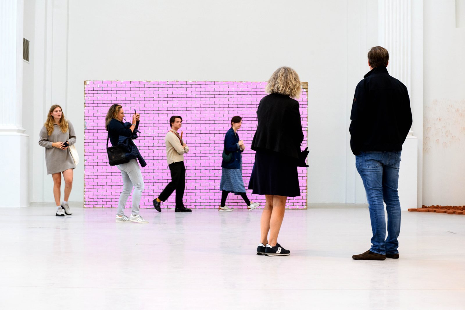 Koen en ik staan voor het werk achtundzwanzigsteraugustzweitausendundneunzehn (2019) van Ugo Rondinone. Een felroze muur achterin de kerk, die afsteekt tegen de oranje en zachtere aardetinten van de verschillende objecten, waaronder What Do You Want, Brick? (2022) links van ons, de muur die Koen met zijn studenten maakte. ‘Ik vind het zo’n mooi ding, want we staan naar een stuk jute te kijken, eigenlijk,’ verklapt hij over Rondinones werk. Ik had het zelf nog niet door, nog druk baksteentermen neerpennend die Koen me allemaal enthousiast vertelt. Het jute is aan de uiteindes van het doek onbeschilderd gelaten, waardoor aan de randen van het doek ook stiksels zichtbaar zijn. Rondinone verenigt in het werk zowel diens moeders als vaders ambacht, respectievelijk waren zij kleermaker en metselaar. ‘Ja het is knap, dat het zo’n gewicht krijgt door dat patroon,’ zegt Koen. ‘Voor baksteenmensen zit er ook wel een soort diepere laag onder. Metselwerk is, bijvoorbeeld volgens vroege architectuurtheoretici als Gottfried Semper, enerzijds deel van de steenhouwerijkunst, anderzijds een vorm van textiel: het gaat over patronen, over weefwerk.’ Hij beschrijft dat je die termen niet al te deterministisch moet opvatten, maar dat ze juist iets moois kunnen uitlokken: ‘Zodra je metselwerk opeens gaat zien als textiel, kan je er als ontwerper als zodanig mee om gaan.’