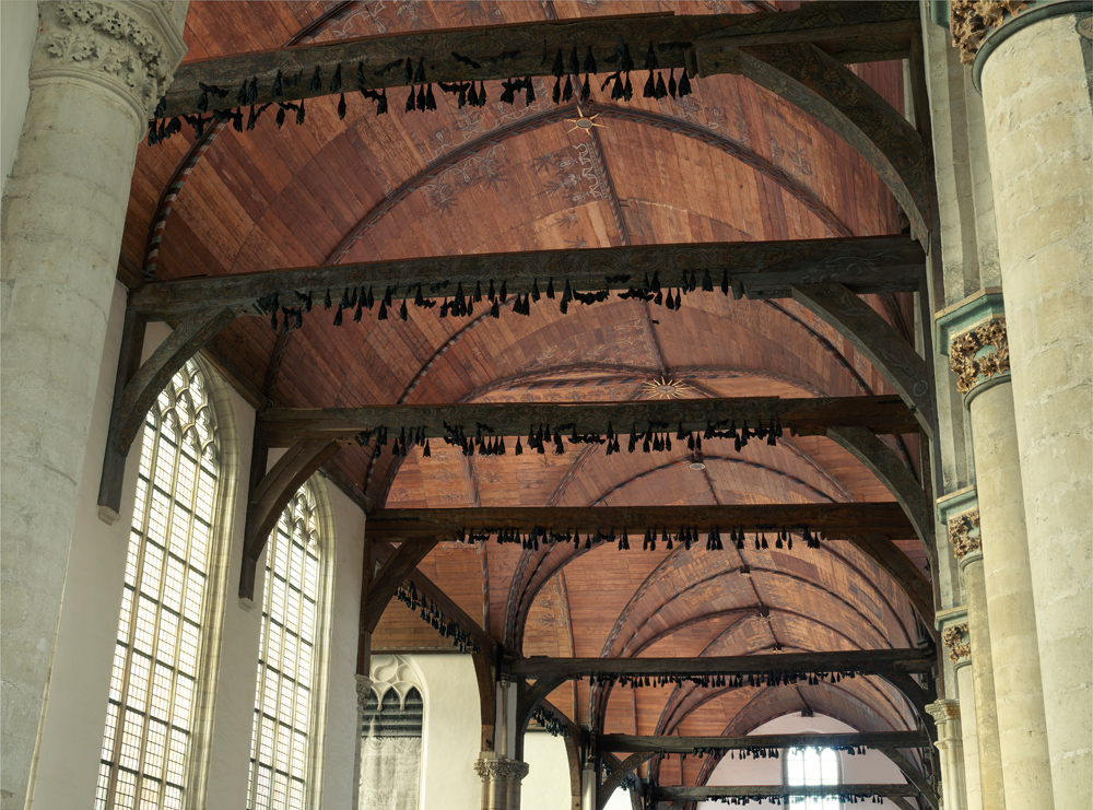 Hoog in de gewelven hangen ontelbare sculpturen van vleermuizen. Zwarte vlekken als omgekeerde kruizen, als symbolen uit een vreemde taal, op hun gemak te wachten tot ze eindelijk mogen, tot ze eindelijk in het donker de hele ruimte weer kunnen overnemen.